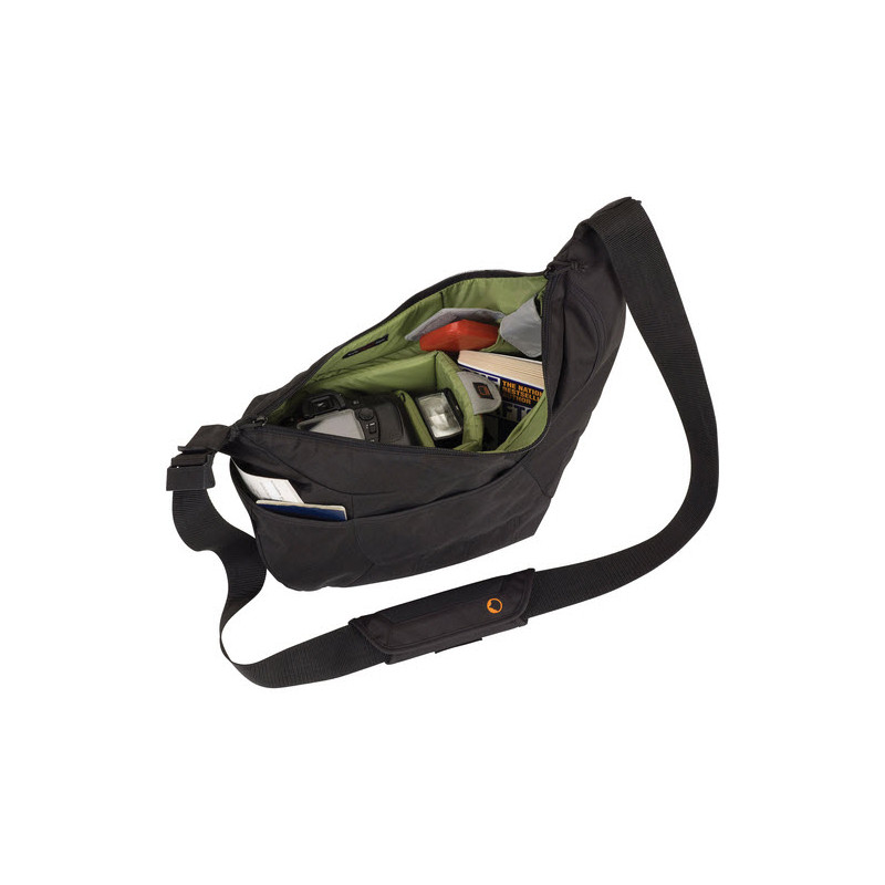 • • Lowepro Паспорт Sling е с уникална и удобна форма за носене ,отговаря на формата на тялото и лесно се движи с него. Добре уплътнено вътршно отделение за защита на вашия DSLR и няколко аксесоари.Има възможност за отделяне на твърдото отделение и свиване на чантата. Отваряемо пространство за разширяване ,което добавя около 30% повече място за лични вещи