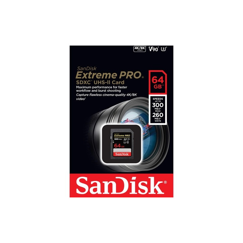 Картата SanDisk Extreme Pro SDXC 64GB UHS-II е бърза и надеждна карта памет с капацитет 64GB и поддържа максимални скорости на четене и запис, съответно 300MB/s и 260MB/s и минимални постоянни скорости на запис от 90MB/s.