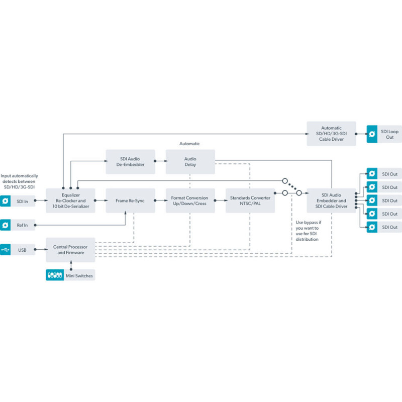 Устройството е оборудвано с два 6G-SDI изхода които поддържат SD и HD-SDI сигнал. Аудиото е вградено в SDI сигнала на изхода - от HDMI входа или от двата 1/4" аудио входа, които поддържат два канала аналогово аудио и 4 канала AES/EBU цифрово аудио.