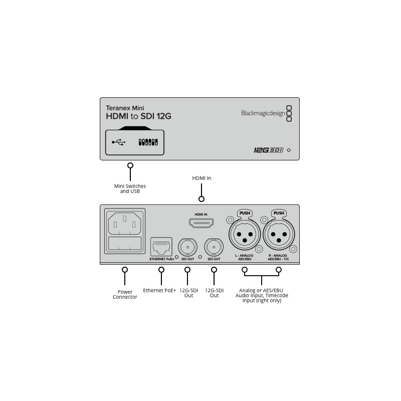 В допълнение, Blackmagic Design Teranex Mini HDMI to SDI 12G Converter предлага два XLR аудио входа, които могат да се настройват за балансирано аналогово аудио или за AES/EBU цифрово аудио.