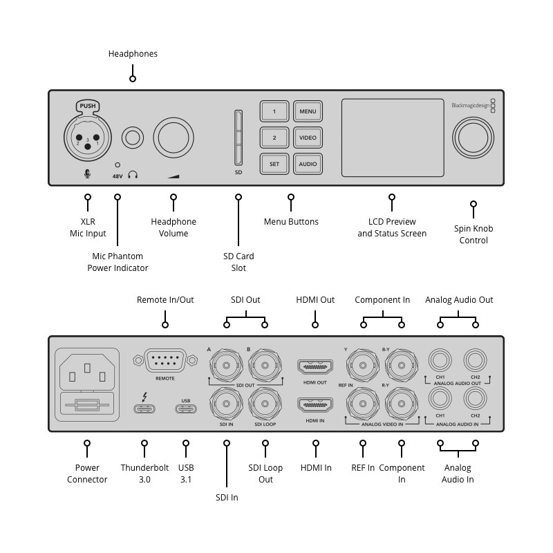 Видео: 1x BNC SDI, 1х HDMI Type A (2.0b) женски, 1x 3BNC Component/Composite, 1x BNC референтен