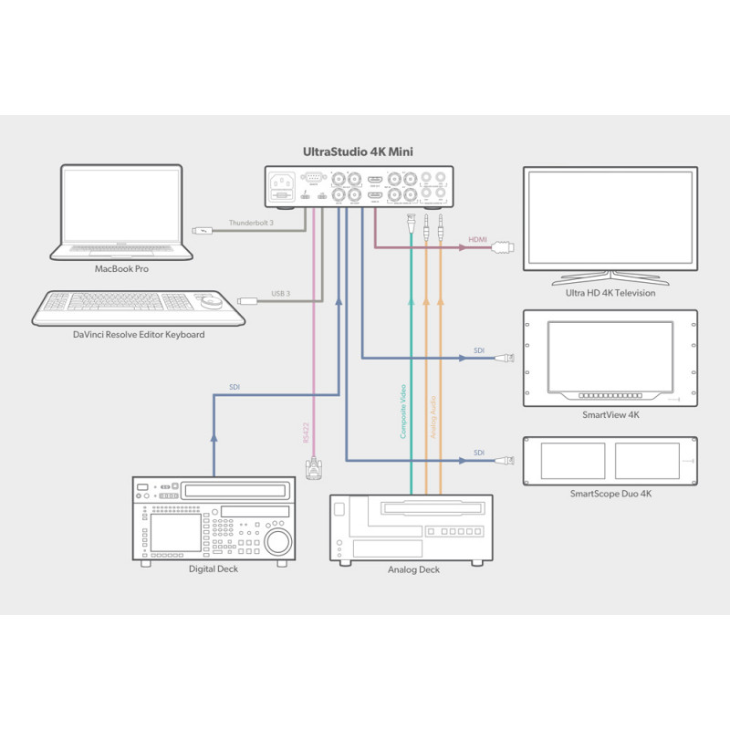 Blackmagic UltraStudio 4K Mini свързва чрез Thunderbolt 3 различни компоненти за кепчър, плейбек или стрийминг със съвместими компютри за възпроизвеждане, запис или обработка.