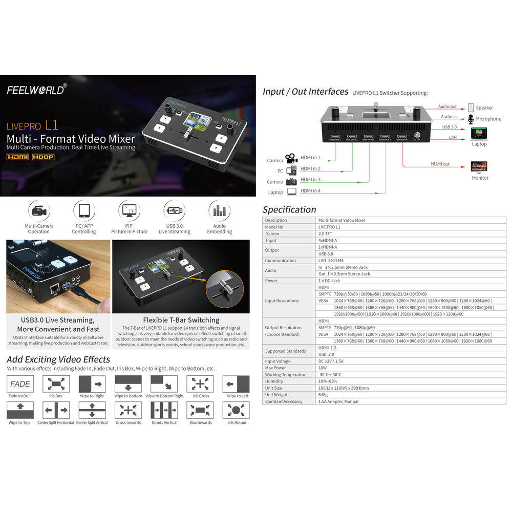 Feelworld LIVEPRO L1 е компактен многоформатен превключвател (switcher) и аудио-видео миксер за Full HD многокамерно предаване на живо, който присъединява до 4 устройства чрез HDMI входове.