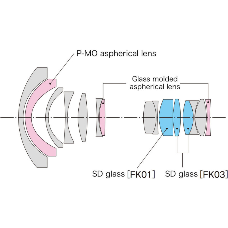 Оптичната схема на обектива включва асферични елементи и такива с ниска дисперсия, които контролират дисторсията и цветовите аберации в целия диапазон на вариото, за да предоставят чисти и резки изображения с точно цветопредаване. Многослойното покритие подобрява контраста, минимизирайки отраженията и призраците за по-добър контраст.