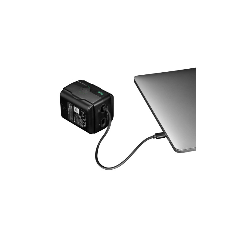 Syrp Battery Bank се зарежда чрез своя USB-C порт и включения кабел за зареждане (USB зарядно не е включено). 5-диоден LED индикатор показва състоянието на батерията.