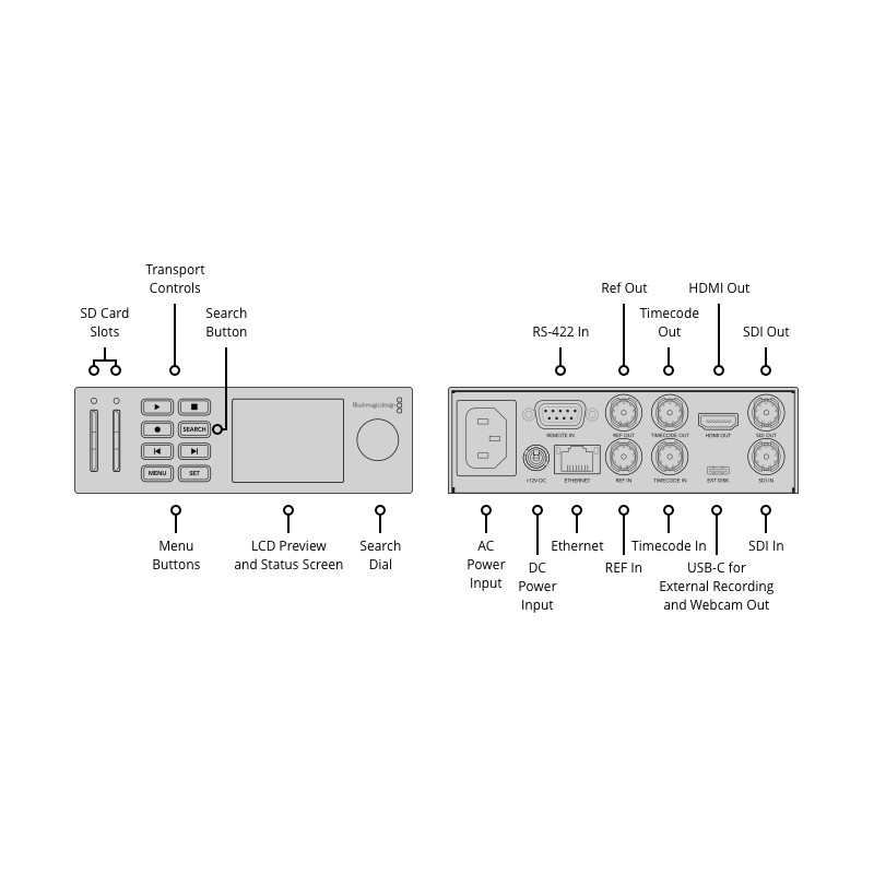 Декът е оборудван с 3G-SDI вход за видео до DCI 4K 30p, HDMI, 3G-SDI и USB-C (webcam) изходи, което позволява едновременното приемане, запис и извод/стрийминг. Записът се осъществява чрез два слота за SD карти или на външен носител през USB-C.