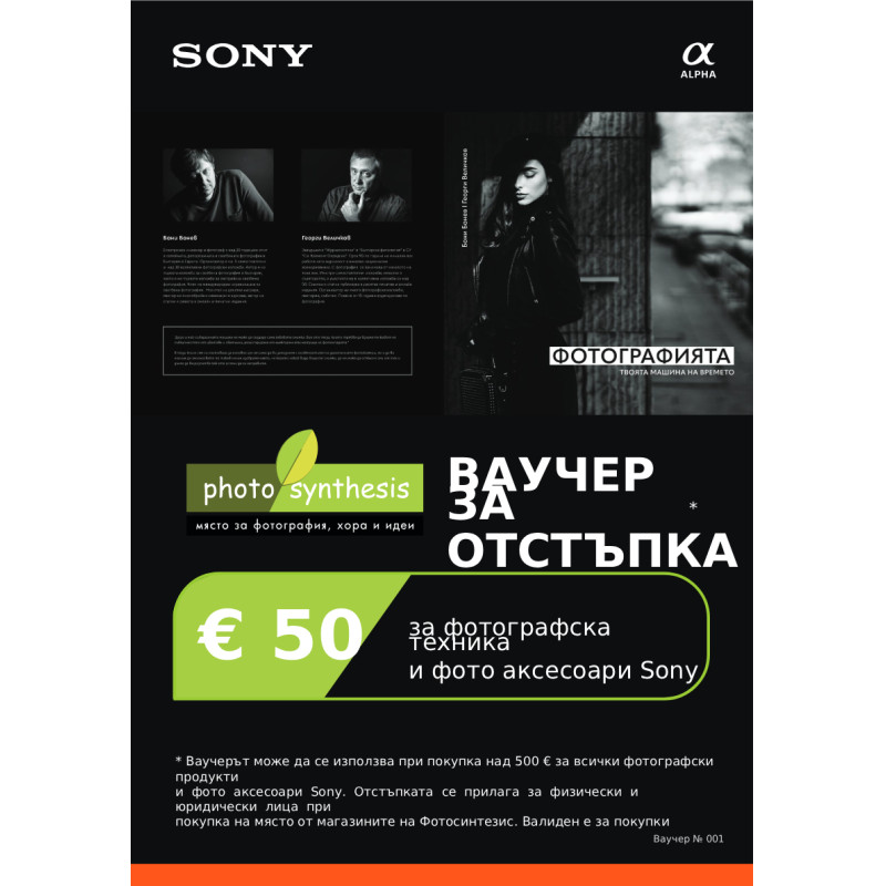 Комплект луксозна книга и ваучер за отстъпка на стойност 50 евро. Отстъпката можете да използвате еднократно при покупка на продукти Sony на обща стойност 500 евро или повече от магазини ФотоСинтезис до 31.12.26.