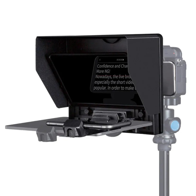 Feelworld TP16 Portable Teleprompter е лесен за сглобяване и е съвместим с широкоъгълни обективи. Поставката за смарт устройство поддържа смартфони и таблети с размери до 16 инча и ширина от 60 до 255мм. Наклонът може да се регулира до 135°, а сенникът се демонтира лесно, когато не е нужен.