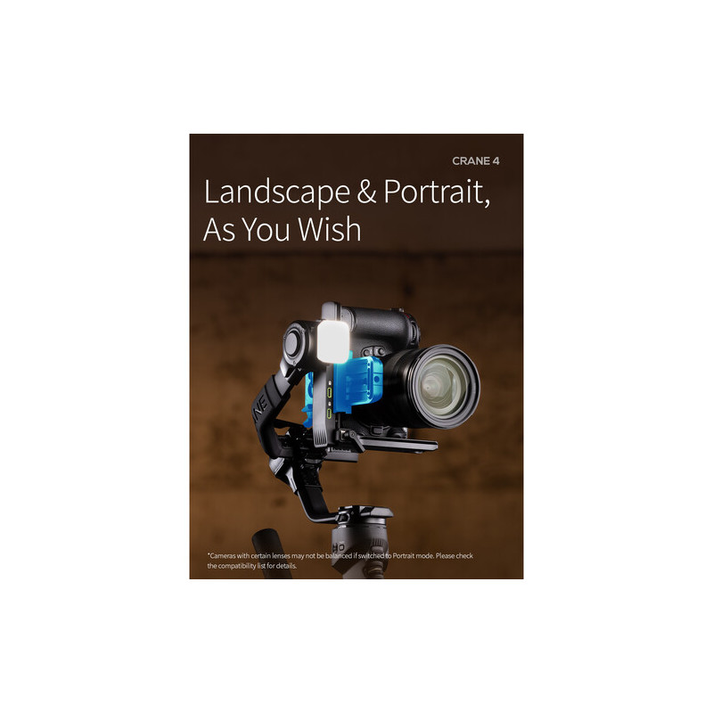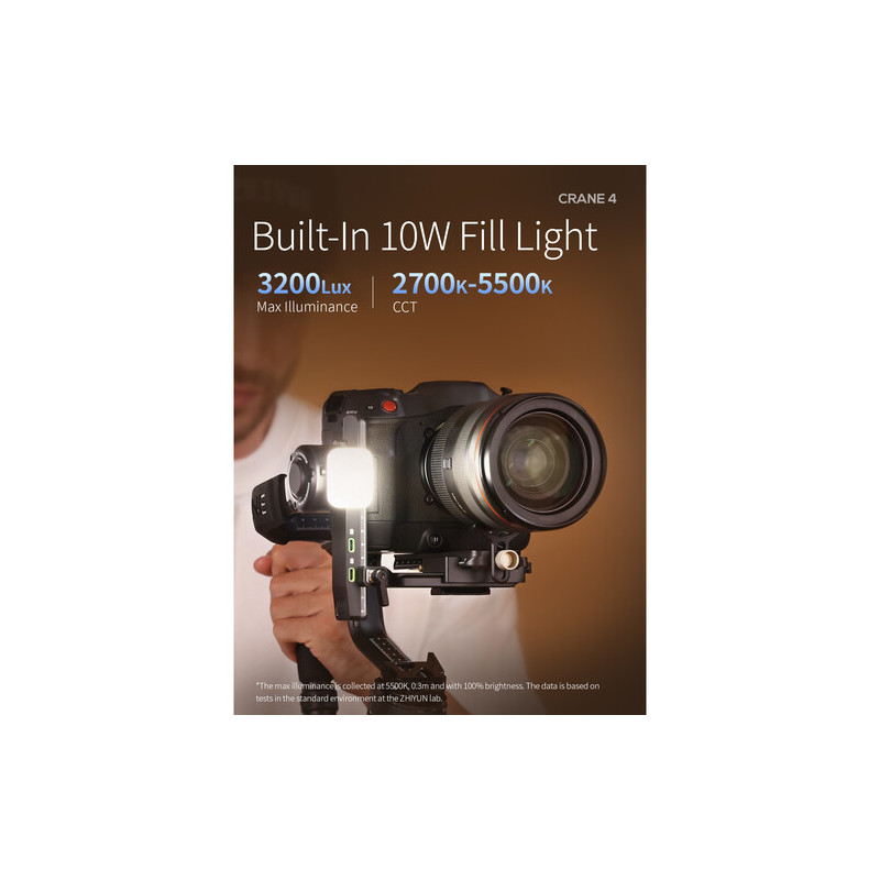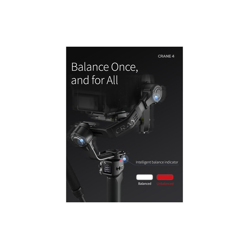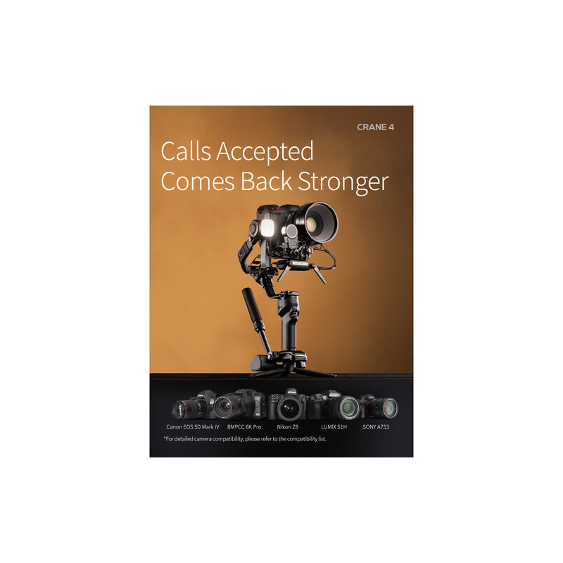 Стабилизаторът Zhiyun-Tech CRANE 4 е 3-осова стабилизираща система зa DSLR, безогледални и компактни кино камери с пълноформатни обективи. Този комплект включва и дръжка и опора за китка за подобрено изживяване при снимане под нисък ъгъл.