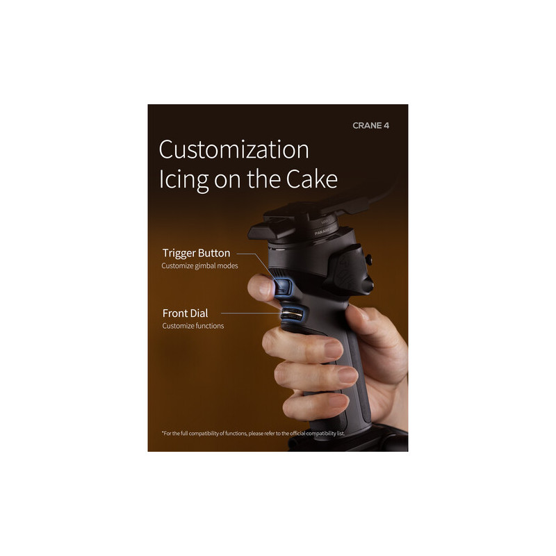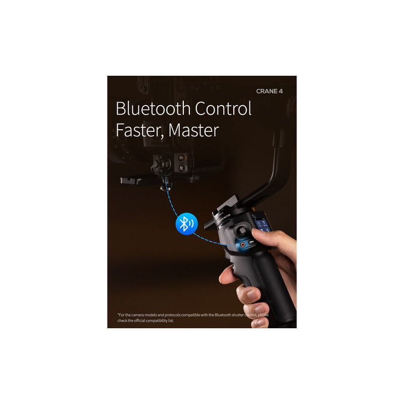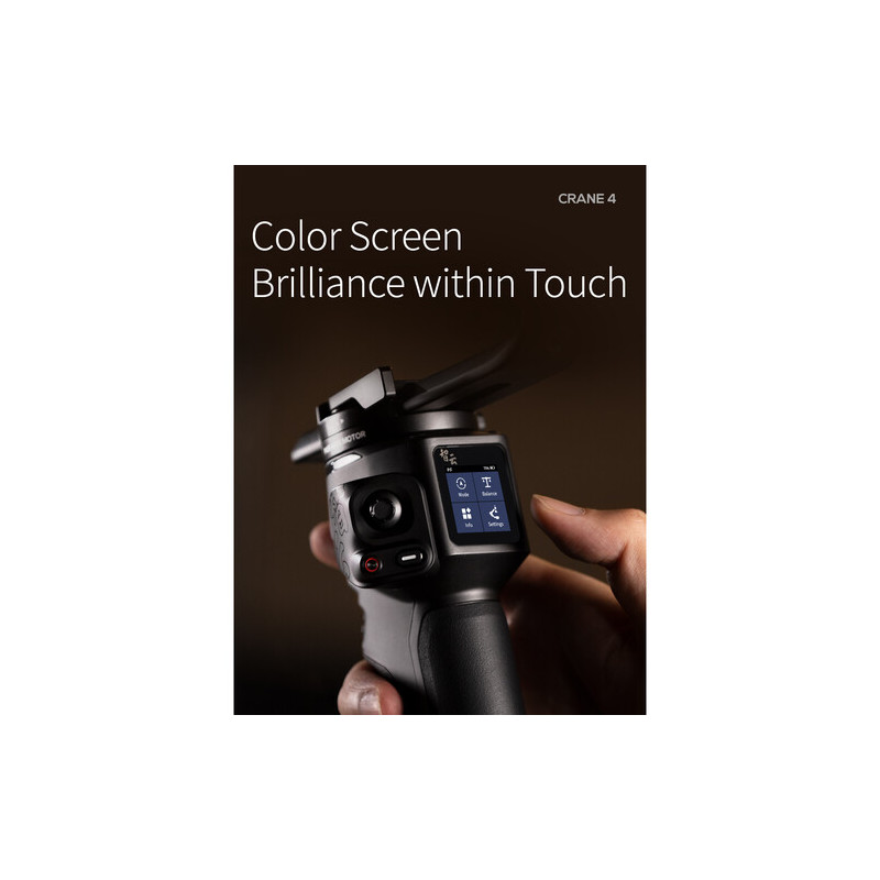 Лесно управлявайте настройките си с 1,22-инчов цветен сензорен екран и безжичен затвор, захранван с Bluetooth. CRANE 4 също така разполага с вградено LED oсветление с мощност 3200 лукса и регулируема цветна температура. Регулируемата ръкохватка, комбинирана с опора за китката значително намалява умората при снимане, като същевременно ви осигурява по-прецизен контрол на движението .