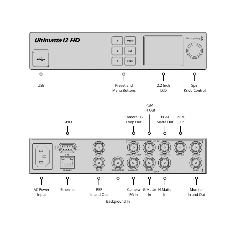 Видеоустройството Blackmagic Design Ultimatte 12 HD Keyer Advanced Compositing Processor е разработено специално за лесен и бърз контрол и композитинг на новинарски, спортни и други продукции с фиксирани камери и статичен фон.