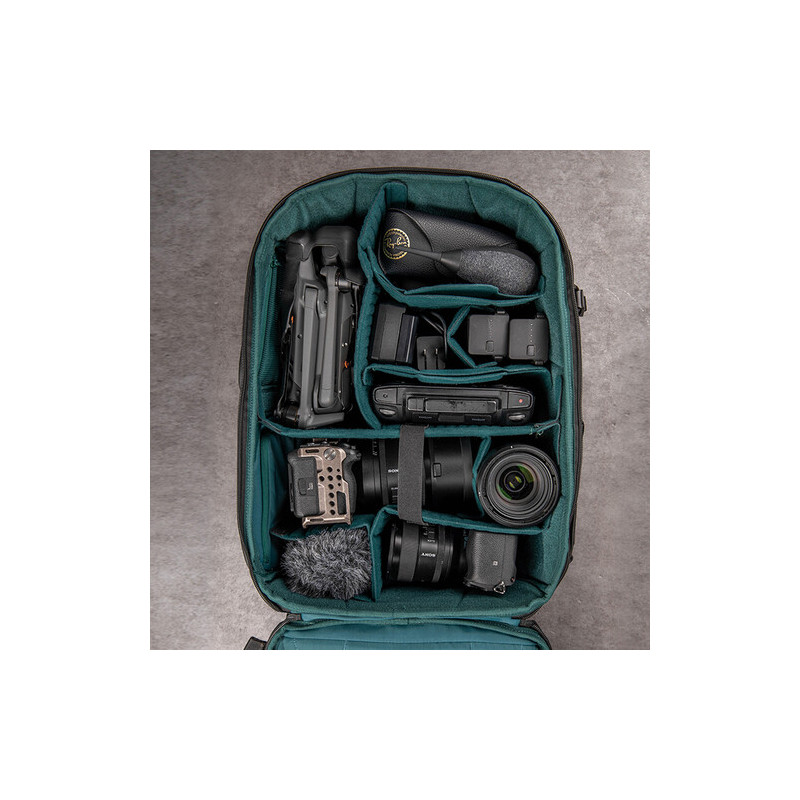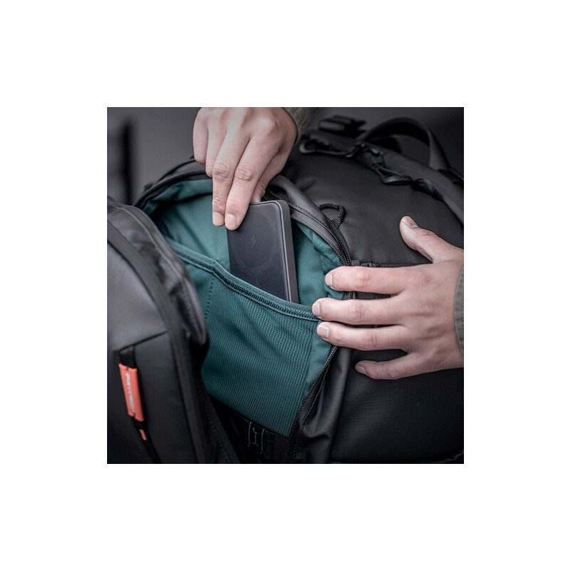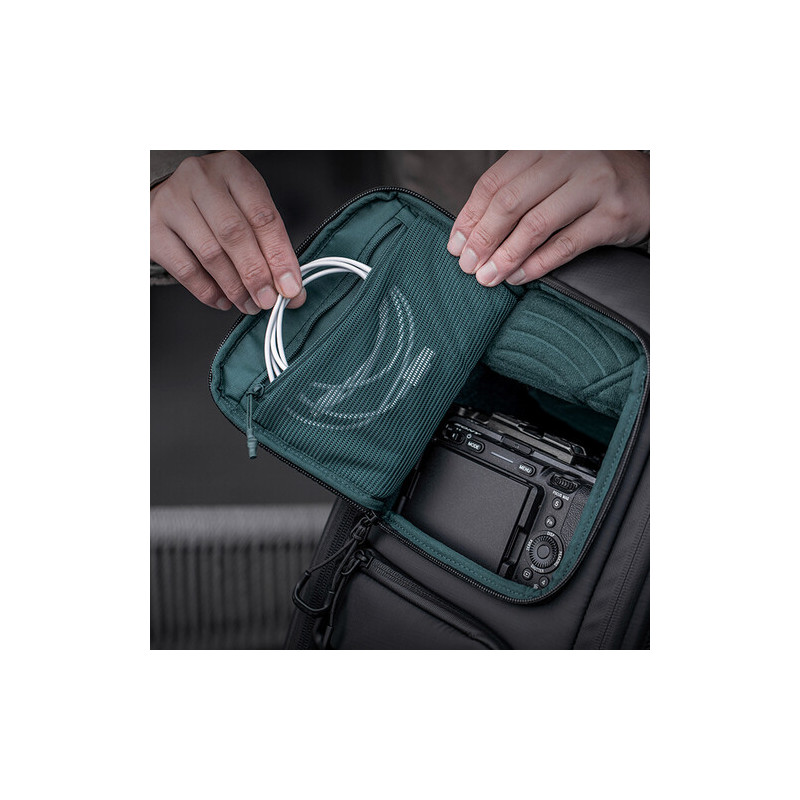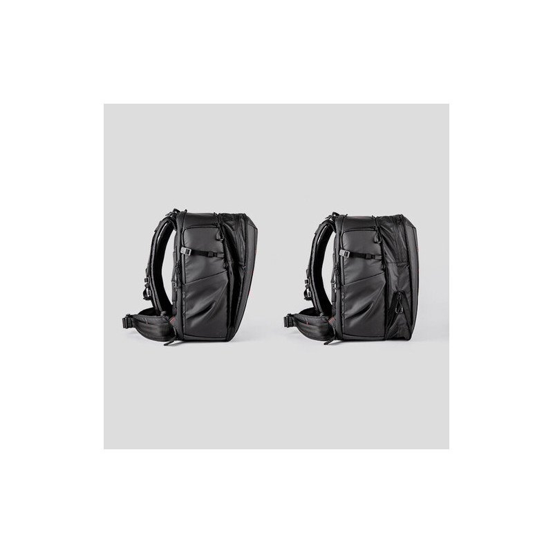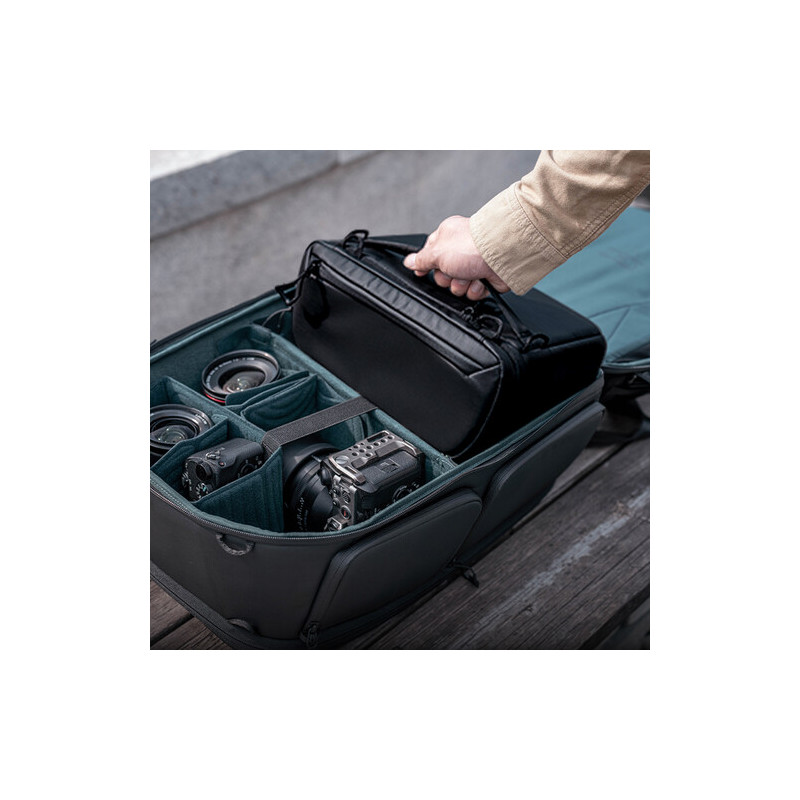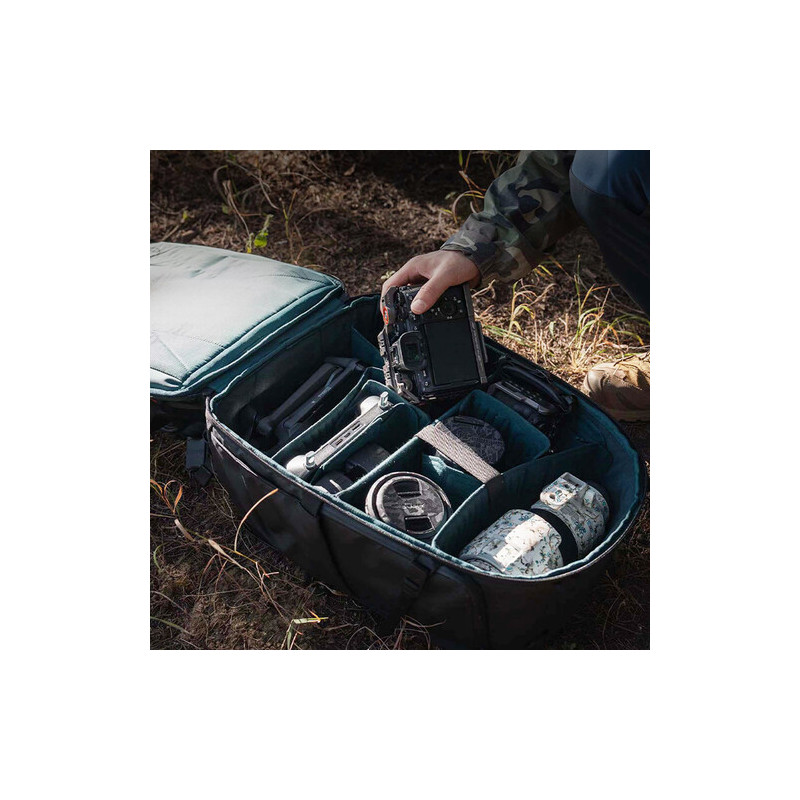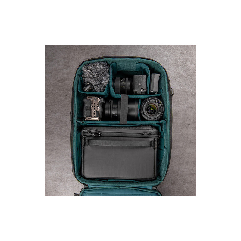 Основното отделение е достатъчно просторно за вашето фотографско оборудване, както и за лични вещи и аксесоари. Достъпът до него се осъществява през широкия заден панел. Множество вътрешни джобове са на разположение: за батерии със система за индикация на мощността, за кабели, документи, смартфон, таблет, лаптоп, филтри, Air Tag и т.н. Предният панел на раницата е с възможност за разширяване, което увеличава вместимостта с 5 до 8литра.