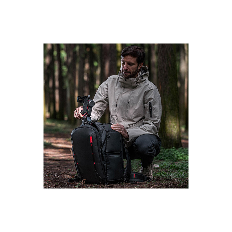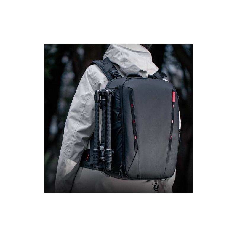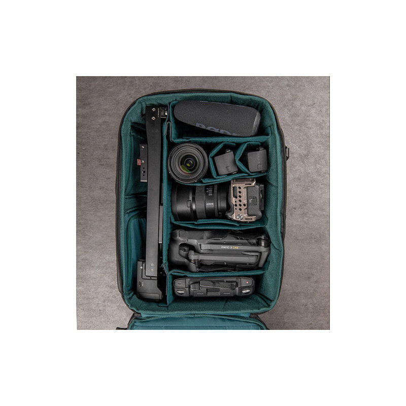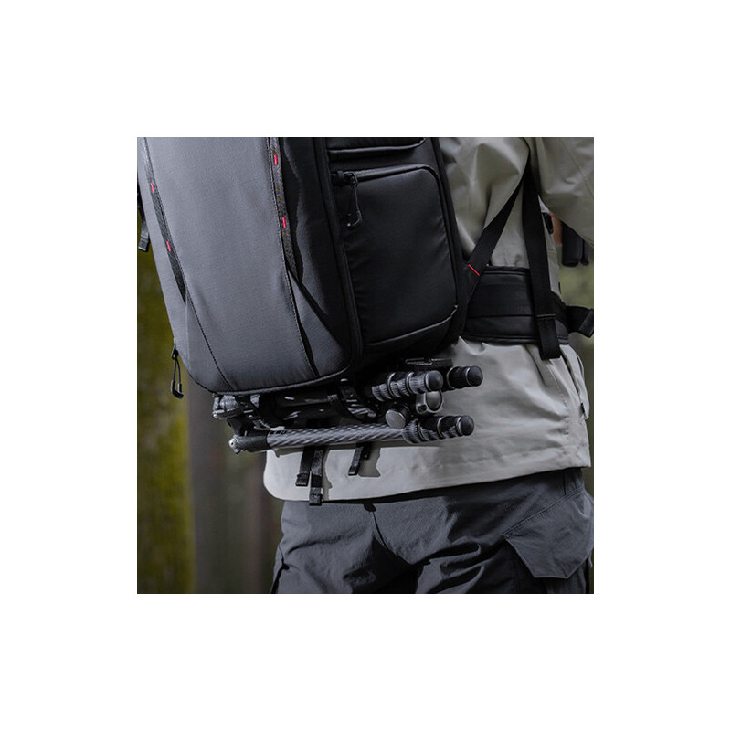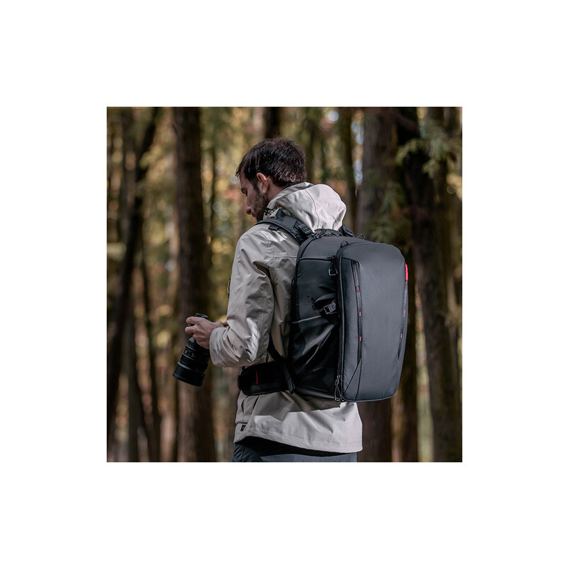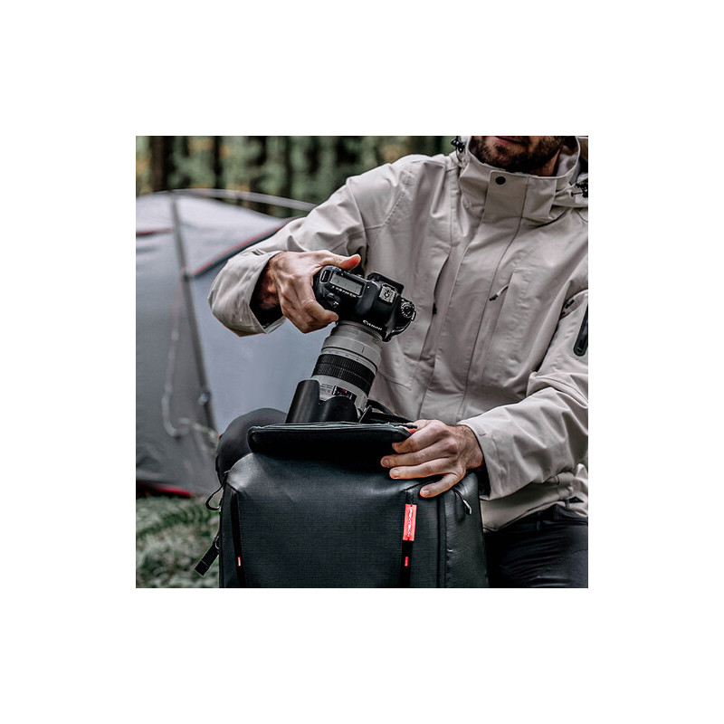 Основното отделение е достатъчно просторно за вашето фотографско оборудване, както и за лични вещи и аксесоари. Достъпът до него се осъществява през широкия заден панел. Множество вътрешни джобове са на разположение: за батерии със система за индикация на мощността, за кабели, документи, смартфон, таблет, лаптоп, филтри, Air Tag и т.н. Предният панел на раницата е с възможност за разширяване, което увеличава вместимостта с 5 до 8литра.