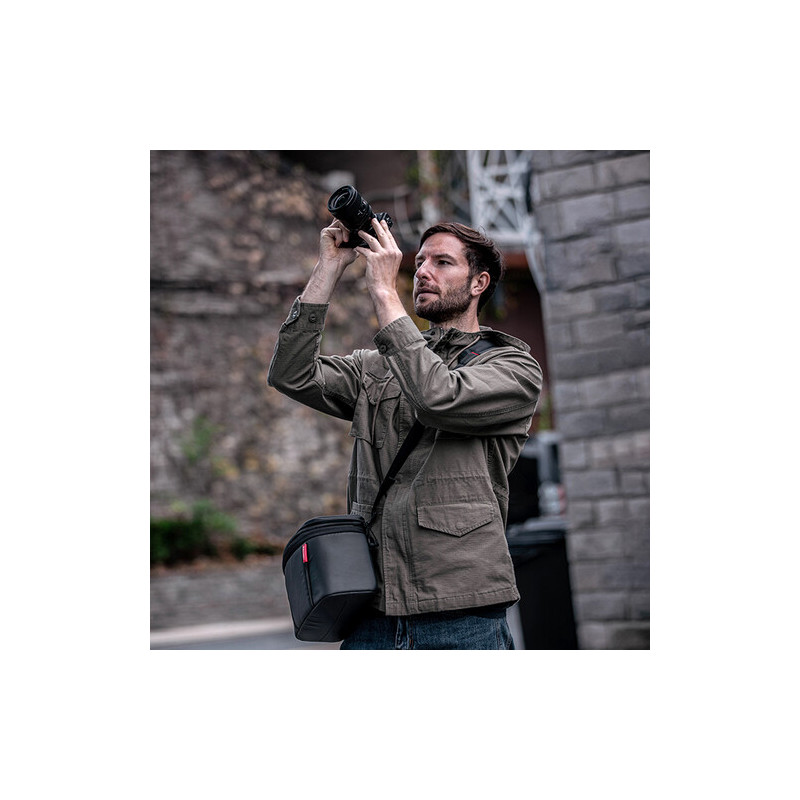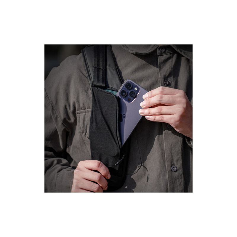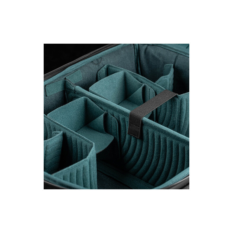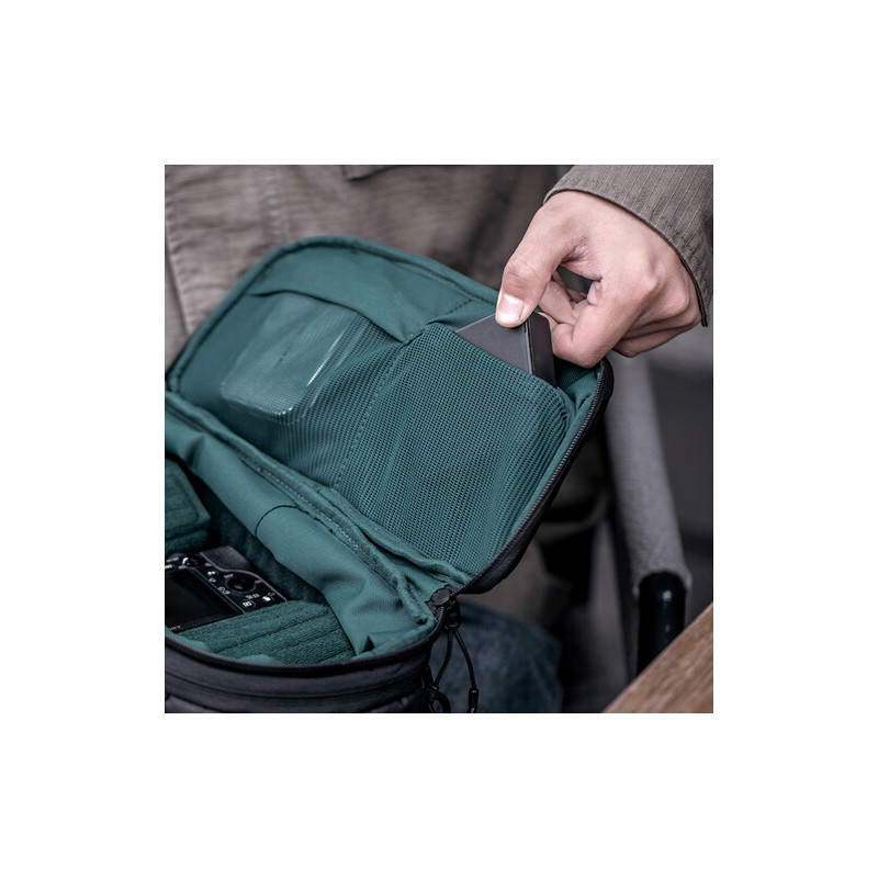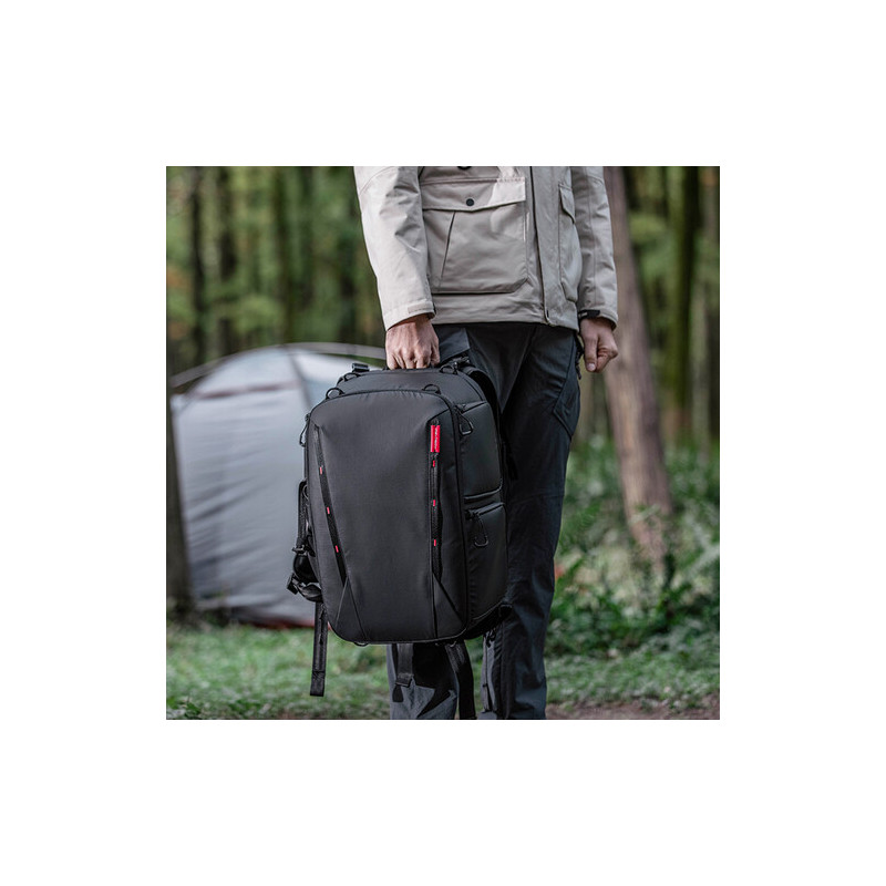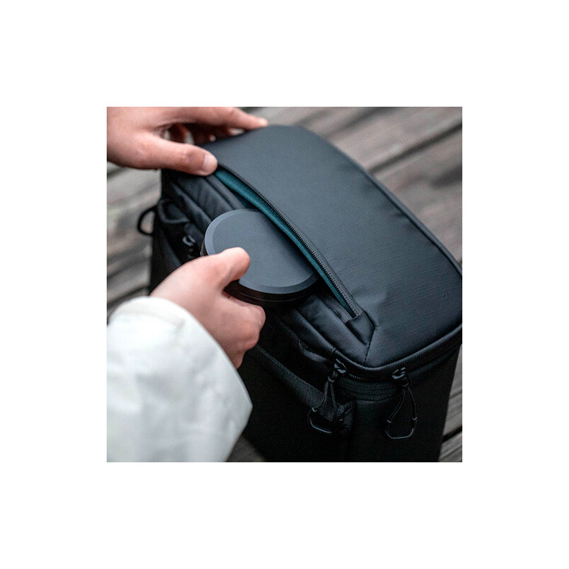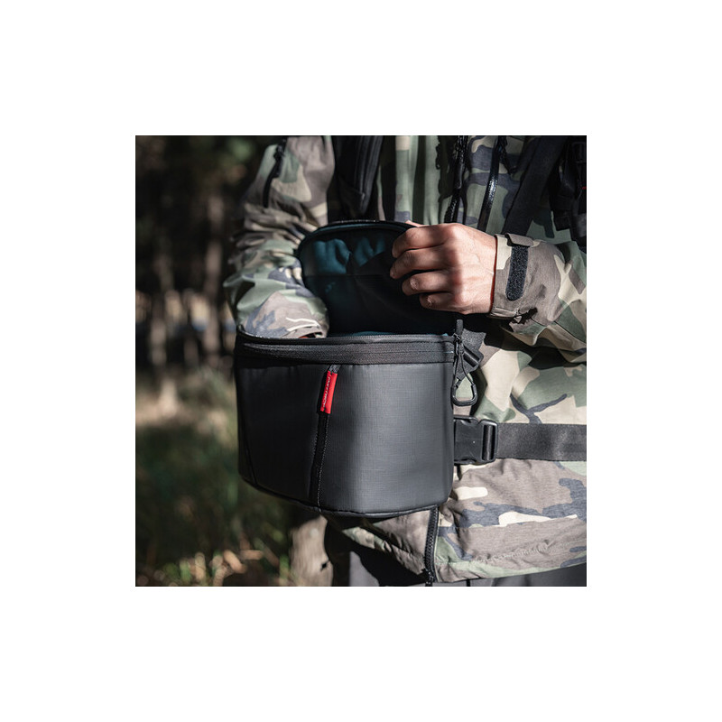Основното отделение е достатъчно просторно за вашето фотографско оборудване, както и за лични вещи и аксесоари. Достъпът до него се осъществява през широкия заден панел. Множество вътрешни джобове са на разположение: за батерии със система за индикация на мощността, за кабели, документи, смартфон, таблет, лаптоп, филтри, Air Tag и т.н. Предният панел на раницата е с възможност за разширяване, което увеличава вместимостта с 5 до 8литра.