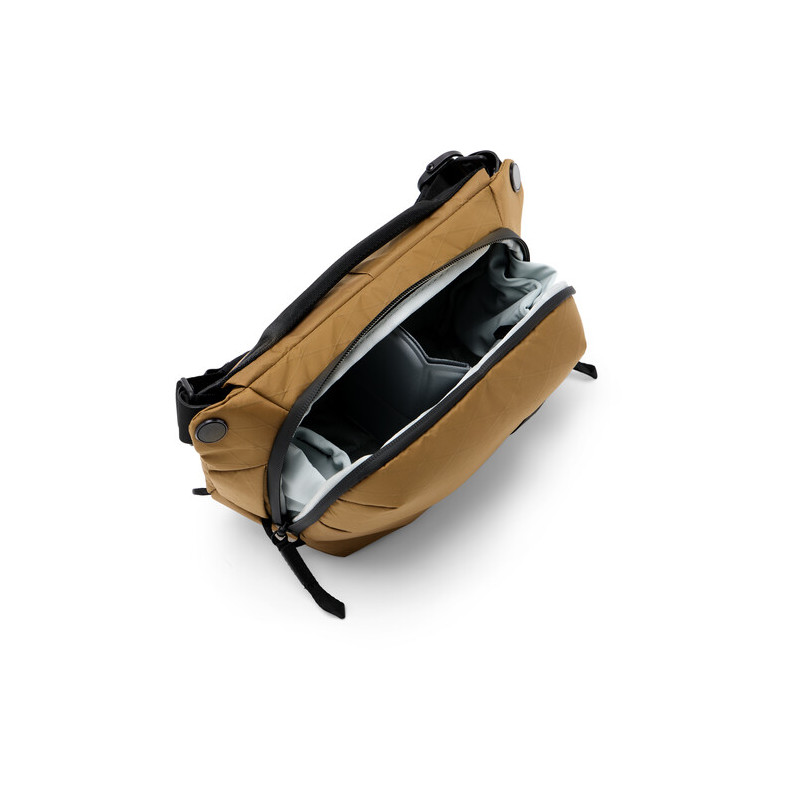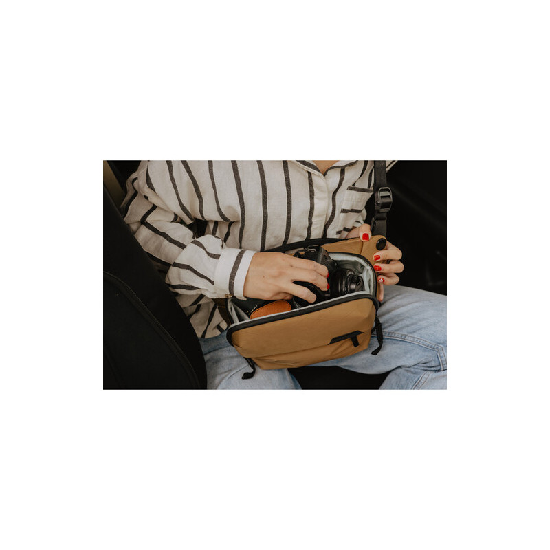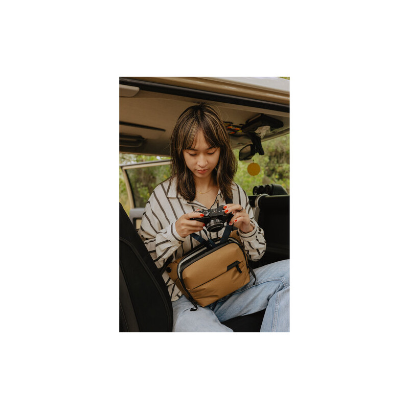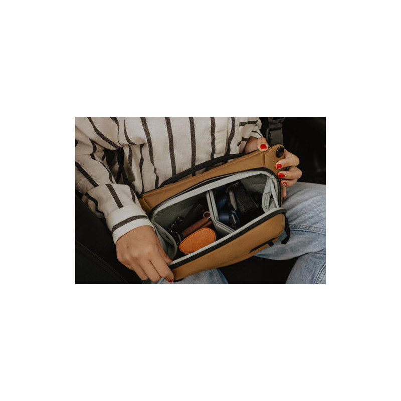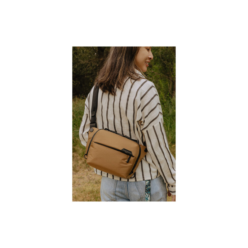 Peak Design Everyday Sling 3L е малка, компактна универсална чанта, която може да се носи както през рамо, така и на кръста. Когато се носи през рамо, подплатения ремък на чантата може да се настрои за дясно или ляво рамо.