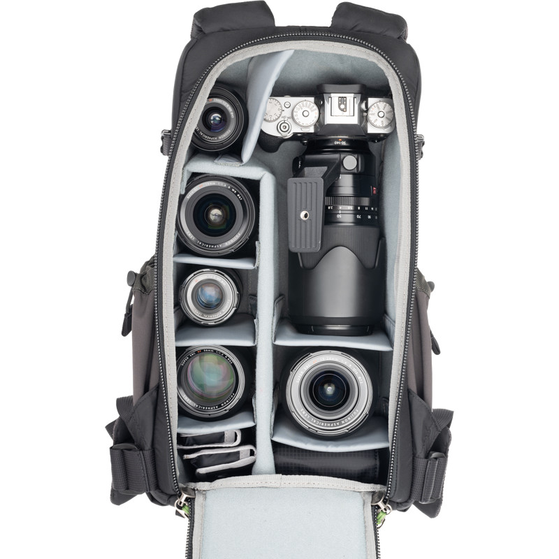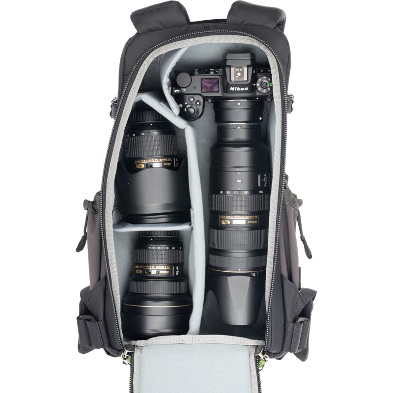 Създадена от водоотблъскващи материали и с висококачествени YKK RC Fuse ципове, тази раница е проектирана да издържи на интензивни условия и да осигури дълготрайна надеждност. Вътрешните отделения могат да бъдат адаптирани с регулируеми разделители, което я прави подходяща както за големи телефото обективи, така и за традиционно фотооборудване или лични вещи.