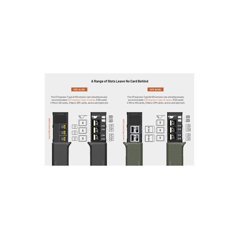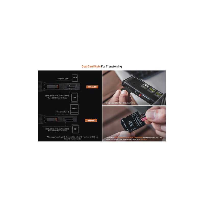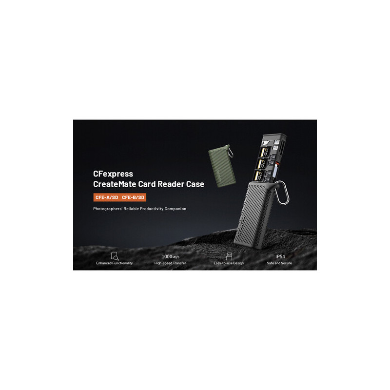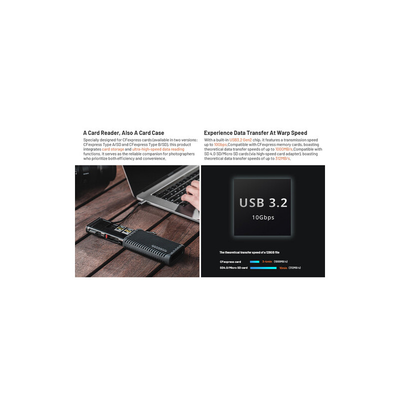 CreateMate обединява функции за организиране и супербързо четене на данни чрез USB 3.2 Gen2 интерфейс, с трансферна скорост до 10 Gbps. Независимо дали работите с CFexpress Type A, SD или Micro SD карти, четецът поддържа горещо разменяне и ви осигурява светкавично бързо копиране на файлове – до 1000 MB/s за CFexpress и до 312 MB/s за SD/Micro SD карти (с адаптер).