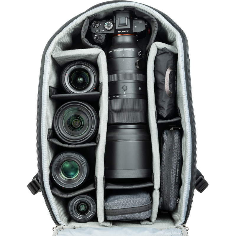 Просторното, подплатено основно отделение с регулируеми разделители побира професионален DSLR с прикачен обектив 200–400mm f/4, седем допълнителни обектива, светкавица и включения дъждобран. Под капака има мрежести джобове с цип за аксесоари. В задната част на раницата е отделение за до 15" лаптоп. Страничните джобове са подходящи за съхранение на бутилка вода, ръкавици или други принадлежности. Разтегливите джобове на презрамките са полезни за съхранение на слънчеви очила или други малки предмети. Над всеки джоб има D-образен пръстен за закрепване на предна камера или друго оборудване.