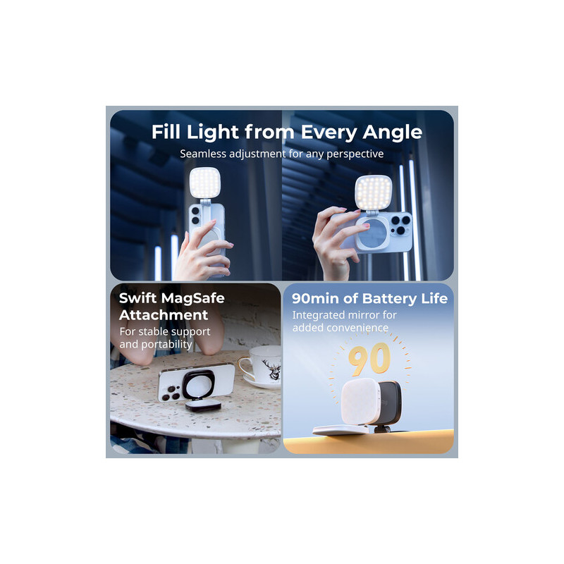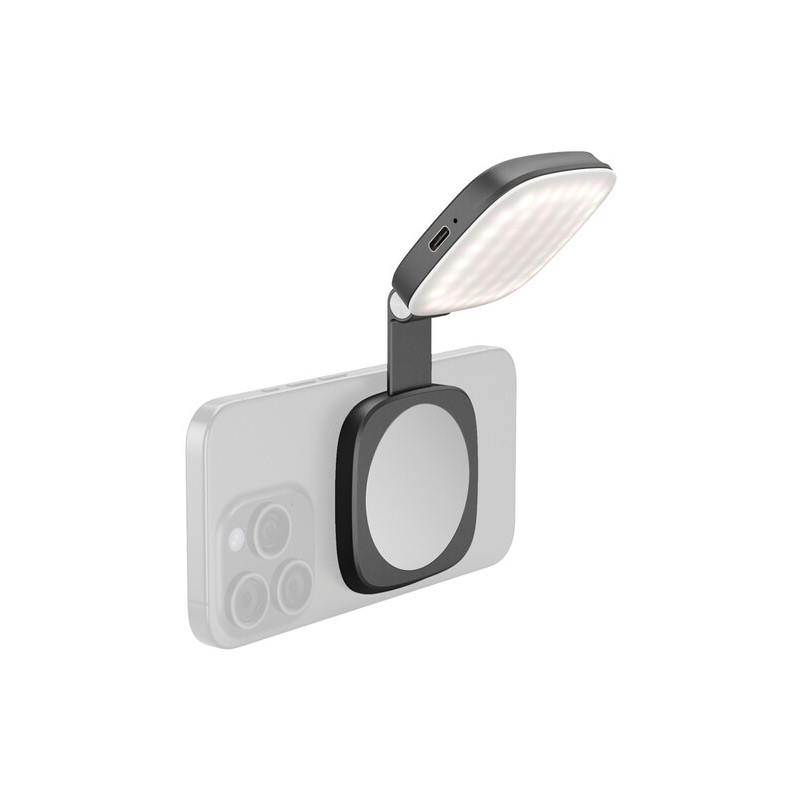 Устройството е снабдено с вградено огледало, което предоставя възможност за прецизно кадриране по време на снимане. В комплекта ще откриете и магнитен пръстен, който осигурява лесно и сигурно закрепване на светлината към устройства, които не поддържат MagSafe, като Android телефони и други подобни устройства.