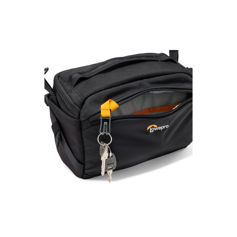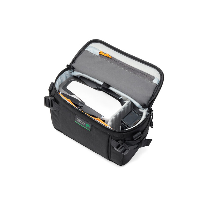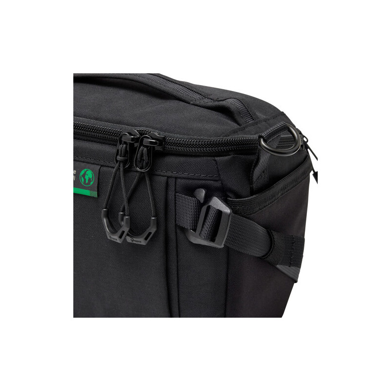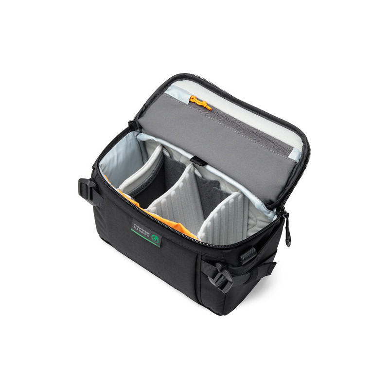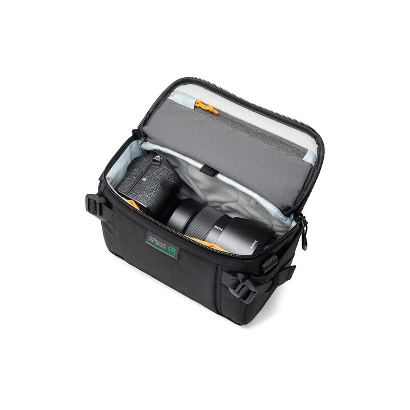 Вътрешността на чантата се организира чрез MaxFit делители, които позволяват индивидуално конфигуриране и ефективно използване на пространството. Отвън ще намерите разтегливи странични джобове за капачки на обективи, преден джоб с ключодържател и органайзер, джоб с цип на вратата, както и плосък подплатен заден джоб за допълнителни аксесоари или документи.