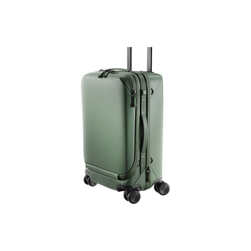 Оборудван е с карбонова телескопична дръжка SlimDrive и тихи, вградени колелца за плавно придвижване. Отварянето тип „мост“ предоставя пълен достъп до съдържанието без нужда от пълно разгъване. Специално отделение побира лаптоп до 16" (например MacBook Pro), защитено с магнитно закопчаване SnapTent, а скрит джоб позволява поставяне на AirTag или Tile тракер.