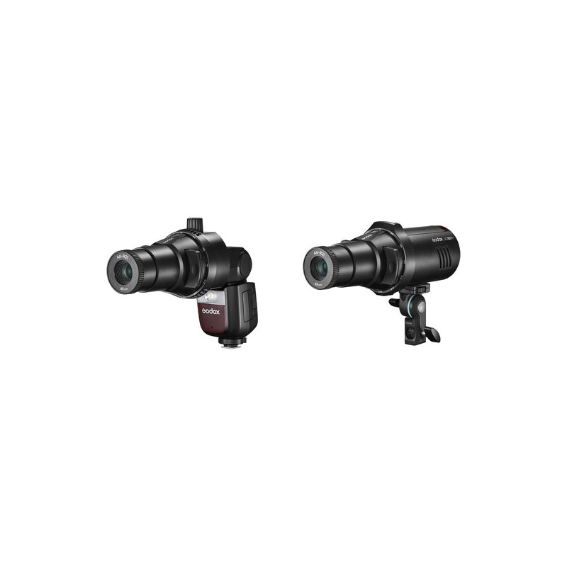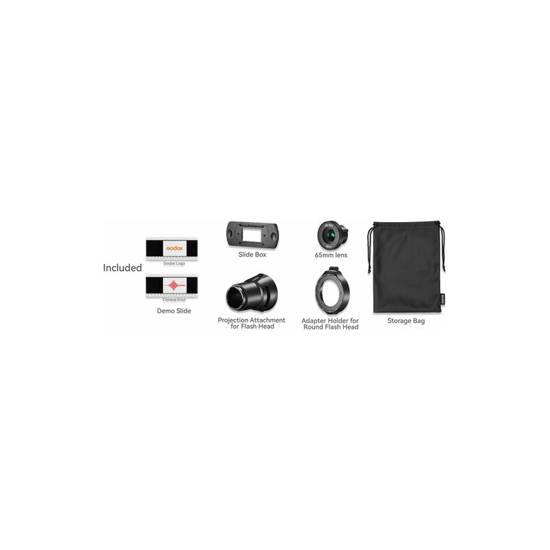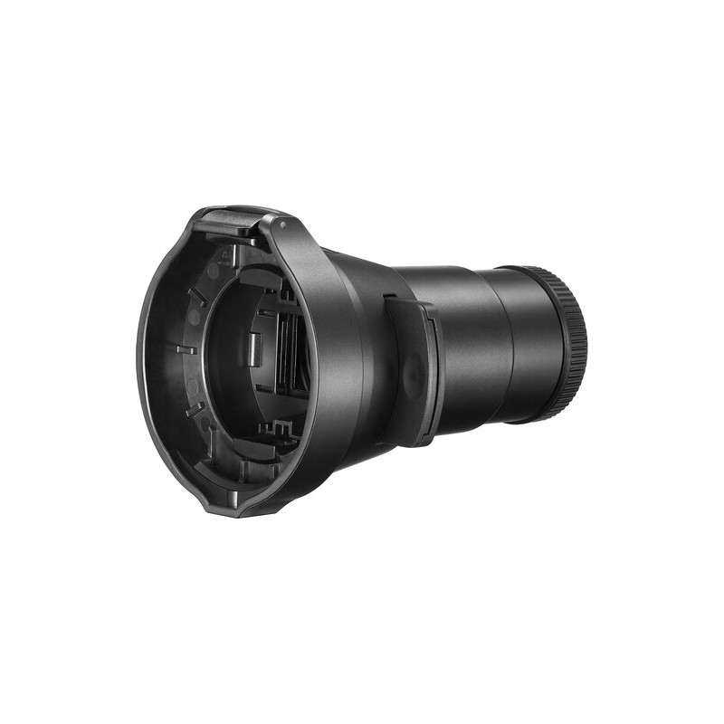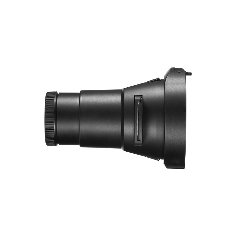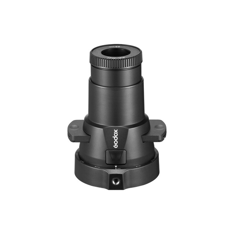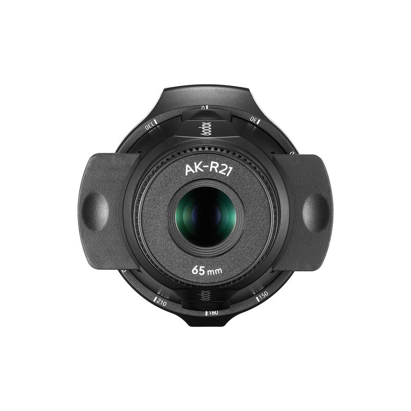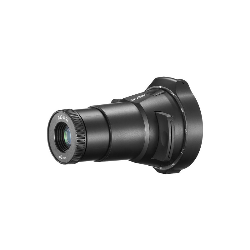 AK-R21 включва в комплекта си оптичен елемент 65 мм обектив, който осигурява прецизно фокусиране и ясно прожектиране на изображенията от ефектните слайдове на Godox. Чрез този обектив светлинният лъч се оформя концентрирано и рязко, като позволява изключителен контрол върху акцентите, сенките и светлинните текстури в кадъра. Подходящ е за портретна, продуктовa, модна и концептуална фотография, както и за видео продукции, където художествената светлина има ключова роля.