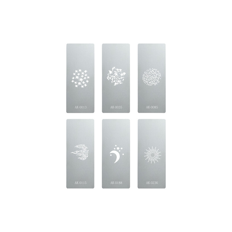 • Комплект от 6 броя гравирани метални шаблона за създаване на светлинни ефекти чрез насочено диодно осветление