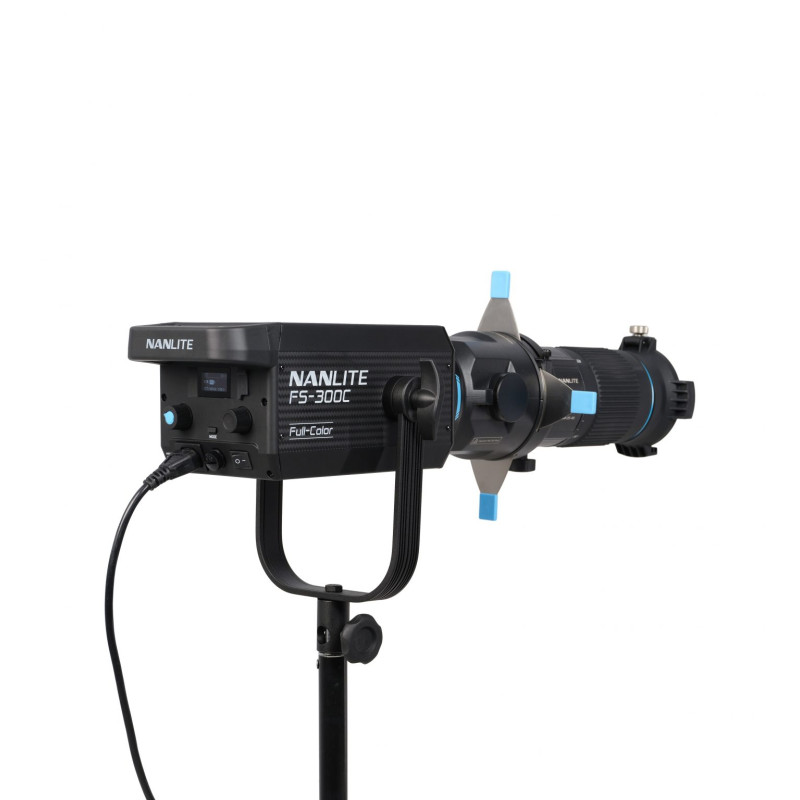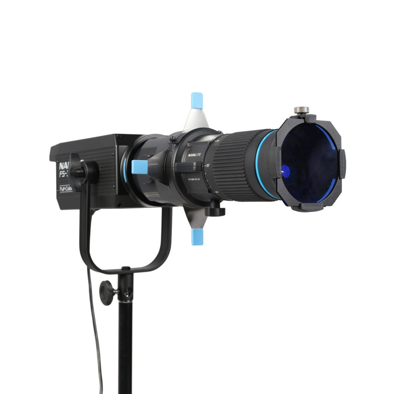 Oптичният спот Nanlite Projector Mount For Bowens Mount 25 - 45° с Bowens монтаж за осветителни тела Nanlite и други, служи за прецизно оформяне на светлината и създаване на прецизни форми и креативни шарки за вашите сцени.