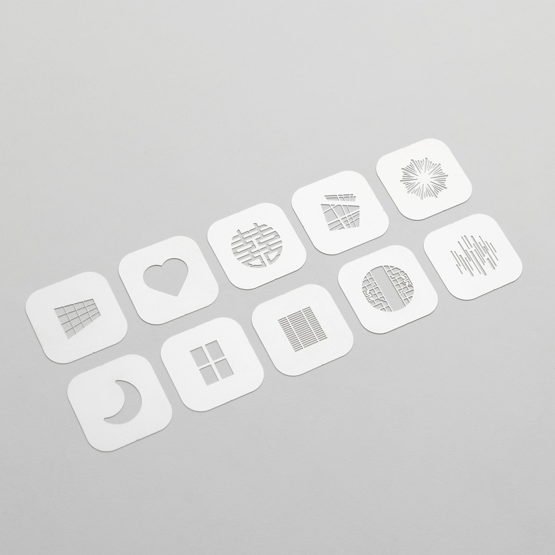 Аксесоарът включва комплект от 10 сменяеми гобо шаблона, които дават възможност за проектиране на артистични светлинни мотиви. Сред включените форми са сърце, луна, китайски прозорец и други абстрактни или декоративни елементи.