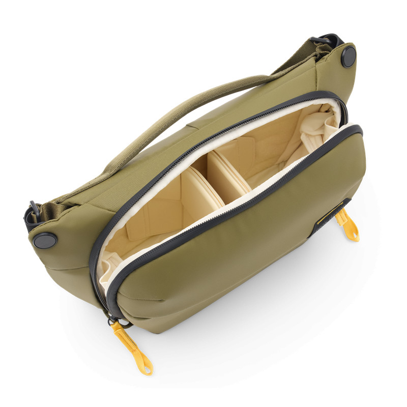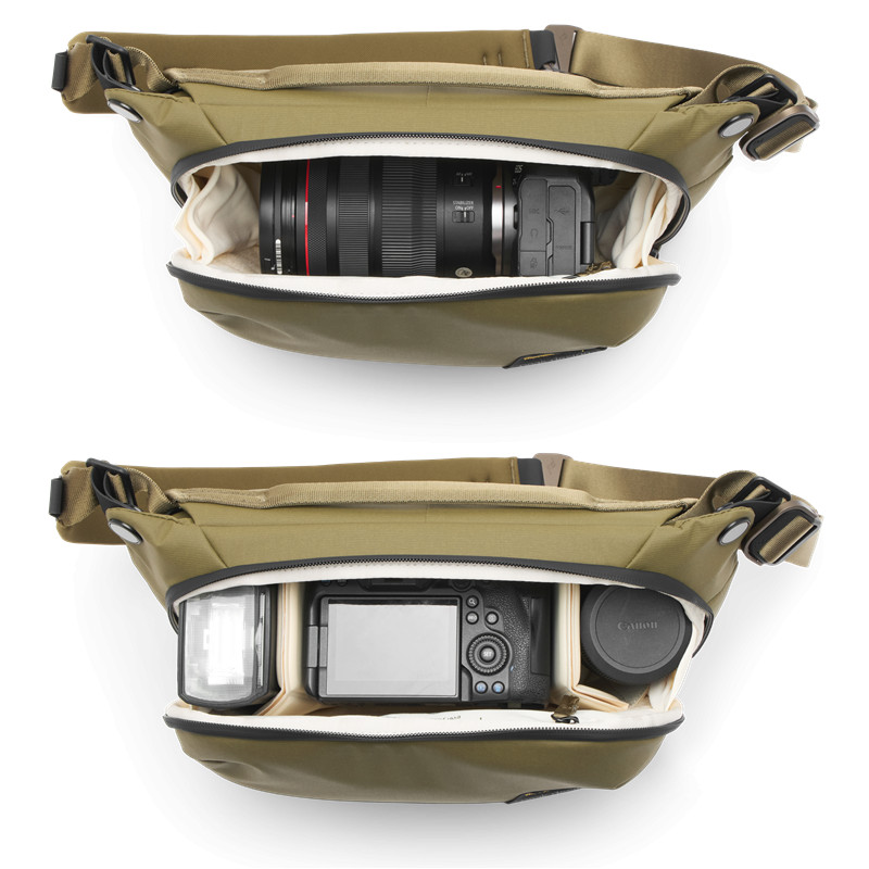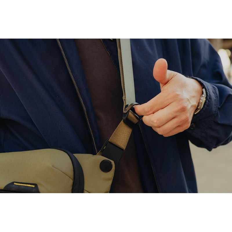 Peak Design Everyday Sling 6L е компактна универсална чанта, която може да се носи както през рамо, така и на кръста. Когато се носи през рамо, подплатения ремък на чантата може да се настрои за дясно или ляво рамо.