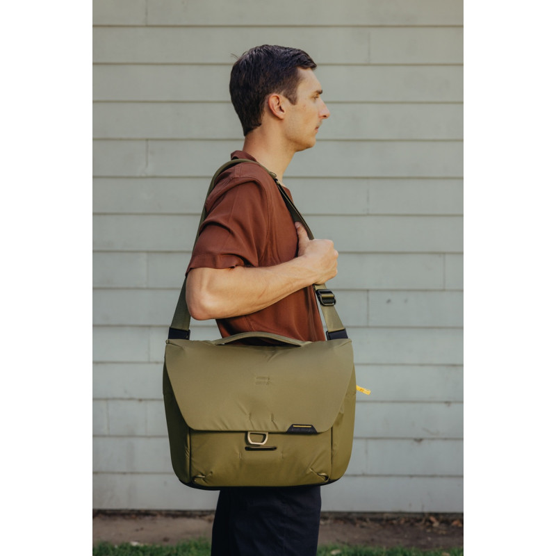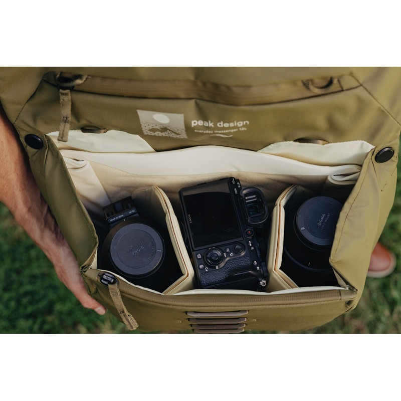 Peak Design Everyday Messenger 13L е универсална чанта, предназначена за фотографи, визуални артисти или всеки, който може да се възползва от нейния сгъваем, регулеруем дизайн. Чантата може да побере някоя от следните конбинации: безогледален фотоапарат с обектив + 1-2 допълнителни обектива и аксесоари; дрон DJI Mavic + контролер, батерии, зарядно и други аксесоари; малък DSLR с обектив + 1-2 допълнителни обектива и аксесоари; full-frame DSLR + 70-200 Pro обектив и аксесоари.