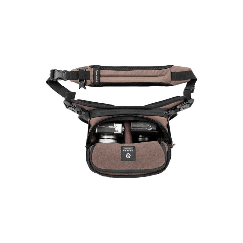 Вътрешността е напълно модулна с подвижна омекотена преграда, която позволява различни конфигурации според типа камера и аксесоари. WANDRD са добавили и по-дълбок външен джоб за бърз достъп, както и скрит джоб за паспорт или документи, което прави чантата подходяща и за пътуване. Вентилираната задна част от дишаща мрежа и регулируемата презрамка с метална катарама осигуряват комфорт дори при продължително носене.