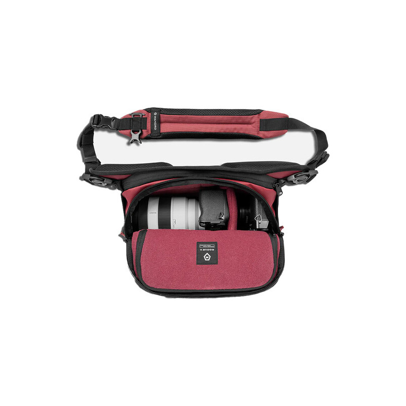 Rogue V2 запазва интуитивната организация на първата версия, но добавя редица подобрения: по-широка презрамка за равномерно разпределение на теглото, по-вентилирана задна част за комфорт при дълго носене и нов механизъм за бързо регулиране, който позволява мигновено преместване от позиция на гърба към достъп отпред. Вътрешността предлага множество джобове , идеални за карти с памет и малки аксесоари, както и скрит заден джоб за документи или телефон.