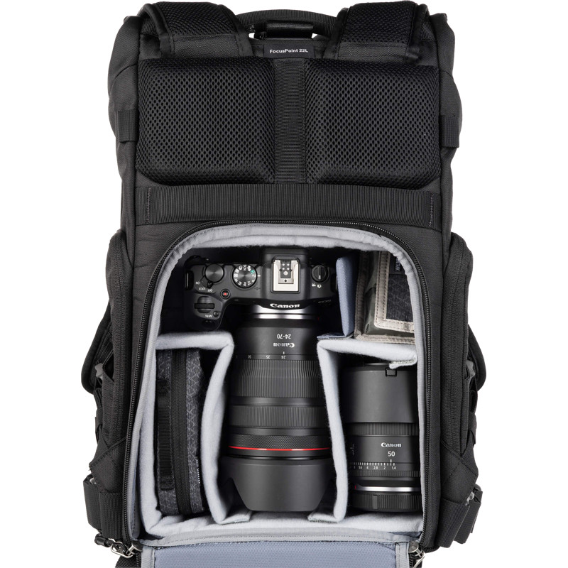Основното ѝ предимство е гъвкавият rolltop дизайн, който позволява увеличаване или намаляване на обема според нуждите. Благодарение на висококачествените водоустойчиви материали и подсиленото дъно, Focus Point Rolltop 30L защитава техниката от влага, прах и механични удари, без да прави компромис с теглото или удобството. Вътрешното пространство е оптимизирано с модулни разделители, които позволяват индивидуална конфигурация за различни видове оборудване от Full Frame фотоапарати и видео камери до дронове, светкавици и обективи.