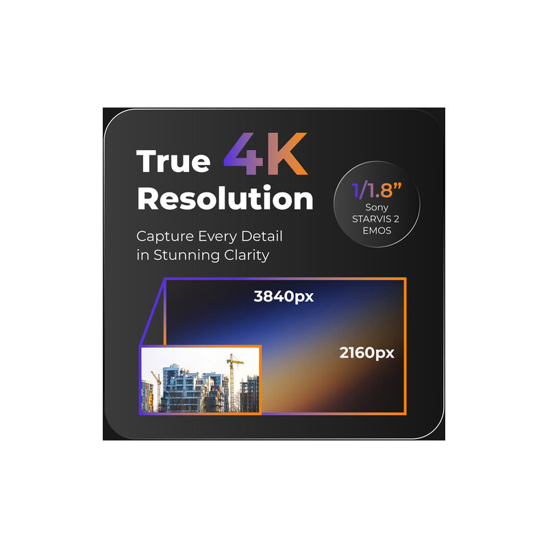 Камерата е оборудвана с 17 mm обектив със светлосила f/2.0 и широк ъгъл на виждане до 118° по диагонал, 106° хоризонтално и 65° вертикално. Това позволява обхващане на големи площи с минимален брой устройства. Широкият обхват е особено полезен при заснемане на строителни площадки, фасадни дейности или мащабни конструкции.