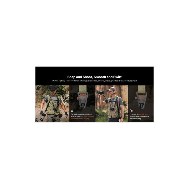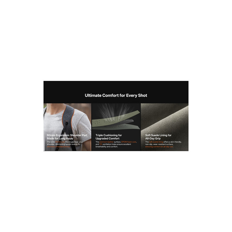 Една от най-силните страни на този модел е възможността да носи до три камери едновременно, без компромис със стабилността и комфорта. Благодарение на интелигентната конструкция и равномерното разпределение на тежестта, оборудването остава стабилно и леснодостъпно, дори при продължителна работа. Презрамката е конфигурирана с Arca-Type бързоосвобождаваща се плочка, което позволява директно преминаване от носене към монтаж на статив без демонтаж на аксесоари.