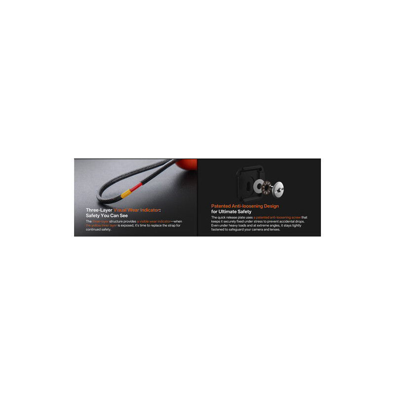 Системата с Quick Release Bead конектори осигурява изключително бързо и сигурно закачане и откачане на камерите. Освобождаването става чрез натискане на горната част на конектора, което прави работата интуитивна и безопасна дори в напрегнати ситуации. Свързващите примки са изработени от трислойна тъкана структура, включително вътрешен слой с визуален индикатор за износване, който ясно показва кога е време за подмяна – важна функция за дългосрочна сигурност.