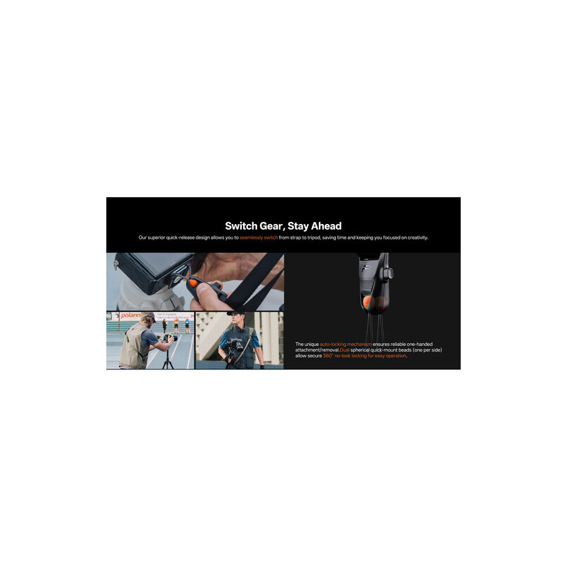 Сърцето на системата е оригиналният Quick Bead Connector с dead-center locking механизъм, който остава заключен, докато свързващите елементи са в правилна позиция. Това осигурява високо ниво на сигурност дори при активно движение. За освобождаване е достатъчно леко натискане на горната част на конектора, което позволява бързо и контролирано откачане на камерата при нужда за бърз монтаж на статив или смяна на аксесоари.