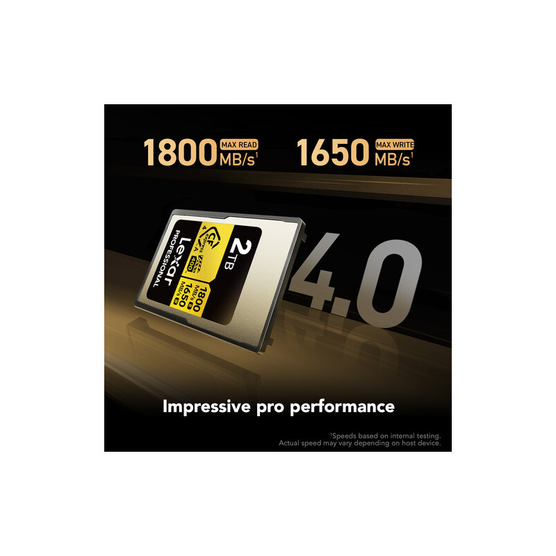 Картата Lexar CFexpress Gold 4.0 2TB Type A е бърза и надеждна карта памет с капацитет 2TB и поддържа максимални скорости на четене и запис, съответно 1800MB/s и 1650MB/s. С минимални постоянни скорости на запис от 140MB/s тя гарантира безпроблемен видеозапис през цялото време.