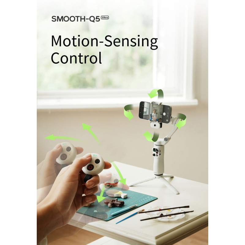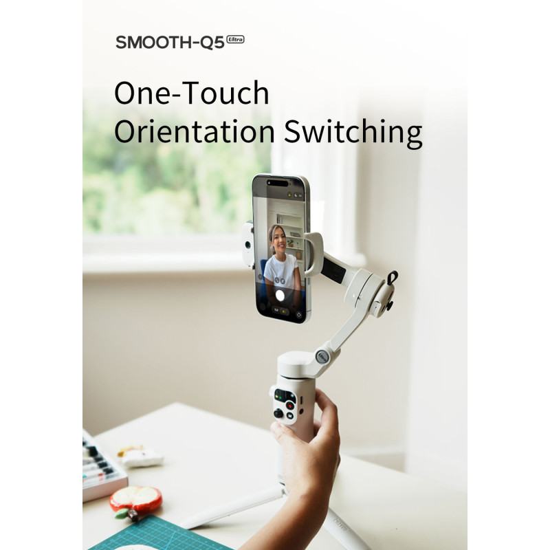 Компактният сгъваем гимбал Zhiyun-Tech SMOOTH‑Q5 Ultra е нов модел стабилизатор за смартфони, създаден да превърне ежедневното видео, влогове, TikTok/Instagram content, travel клипове и домашни продукции във висококачествено съдържание — без нужда от тежка и скъпа техника. С обновен дизайн, подобрена механика и ползотворни функции, Zhiyun SMOOTH Q5 Ultra е насочен към създатели на съдържание, които искат стабилност, лесна употреба и гъвкавост в едно. Zhiyun-Tech SMOOTH-Q5 Ultra е смартфон гимбал за влог, създаден за съвременните content creators, влогъри и мобилни видеографи.