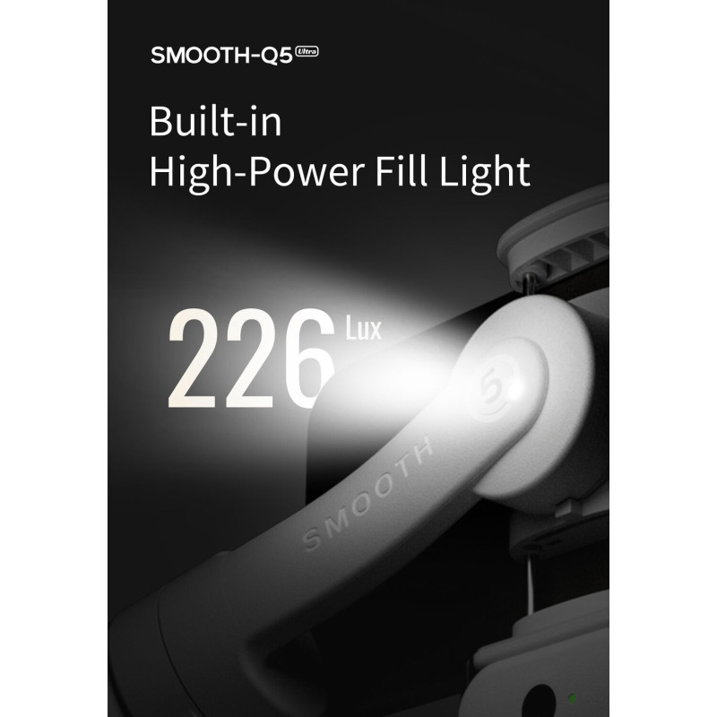 Zhiyun-Tech SMOOTH-Q5 Ultra е идеалният смартфон гимбал за влогъри и създатели на съдържание, които искат качествени резултати. С 3-осна стабилизация, интелигентни режими, вградена LED fill light и лесни контроли, Q5 Ultra осигурява плавно, стабилно и качествено мобилно видео. Това е стабилизатор, който комбинира удобство, функционалност и прецизен контрол, идеален за TikTok, Instagram, YouTube или всякакви мобилни видео проекти.