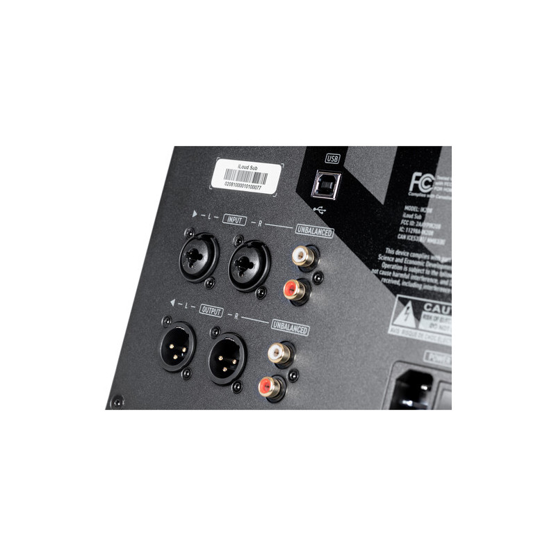 По отношение на свързаността, iLoud Sub е изключително гъвкав. Разполага с балансирани комбинирани XLR/TRS входове, небалансирани RCA входове, както и съответните XLR и RCA изходи, което позволява директно включване между аудио интерфейс и монитори. Вградената Bluetooth свързаност добавя допълнително удобство за бързо референтно слушане от мобилни устройства, без да се засяга основната студийна конфигурация.