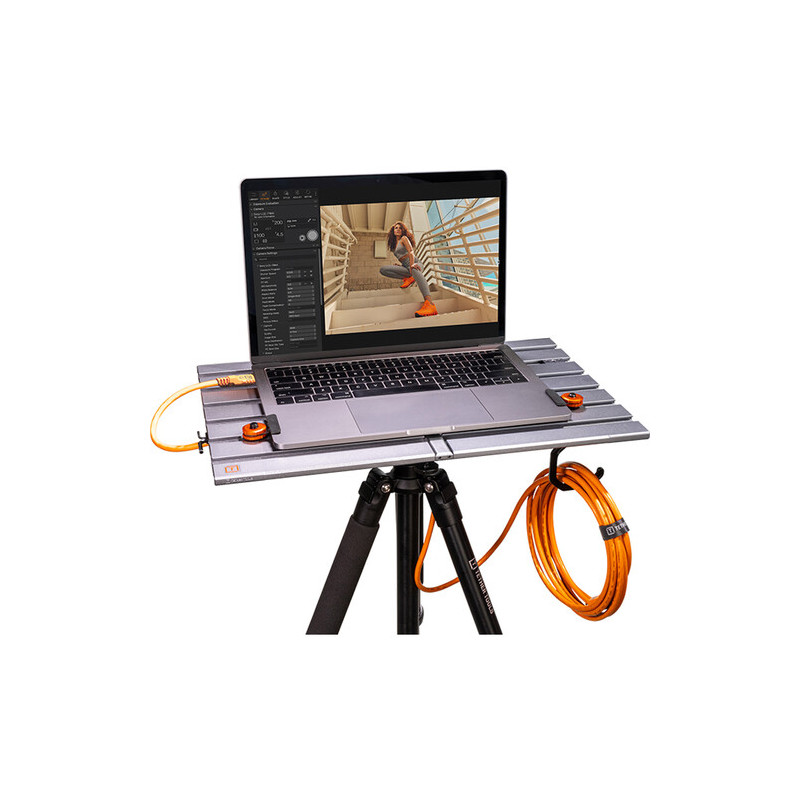Работната платформа е изработена от анодизиран алуминий с CNC обработка, което осигурява отлична устойчивост при ниско тегло. Конструкцията е проектирана да поема сериозно натоварване, като поддържа лаптопи, монитори и периферия стабилно и без усукване. Вентилационните отвори в повърхността подпомагат охлаждането на техниката при продължителни снимачни сесии.