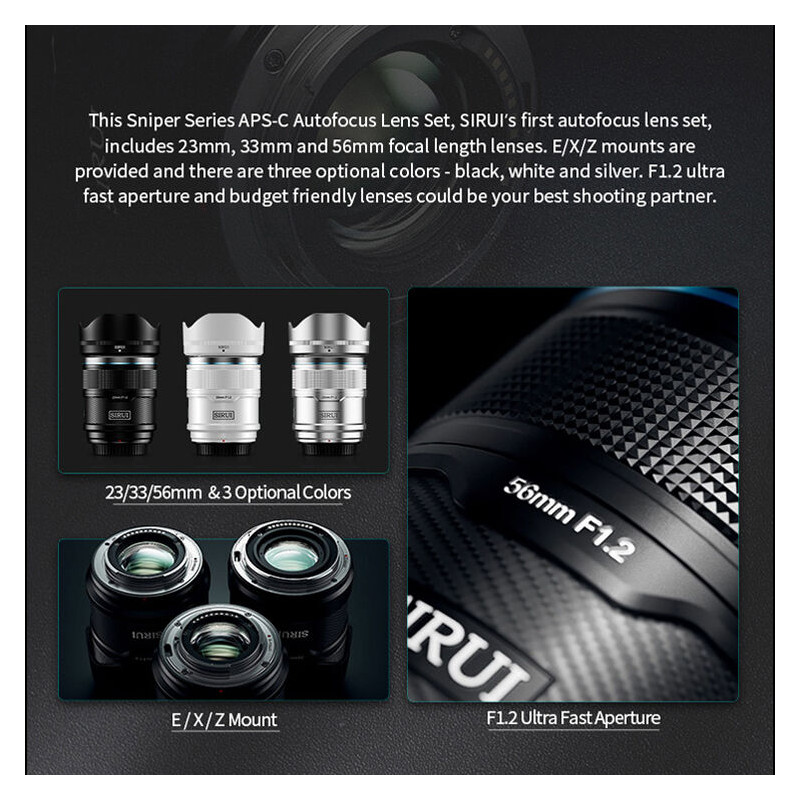 Sirui Sniper Series AF 56mm F/1.2 APS-C е подходящ за хора, които търсят светлосилен портретен обектив с висококачествено оптично представяне, лек и надежден дизайн, подходящ както за аматьори, така и за професионални фотографи и видеографи.