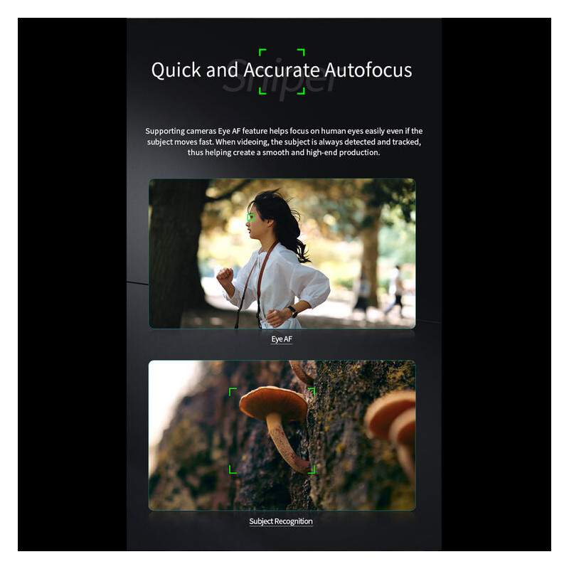 Обективът Sirui Sniper Series APS-C AF 33mm f/1.2 е твърд обектив с нормално фокусно разстояние, проектиран за безогледални фотоапарати с APS-C сензори. Той предлага еквивалентно фокусно разстояние от около 50мм на пълноформатна камера, което го прави отличен избор за портрети, улична фотография, репортаж и работа при по-слаба светлина. Светлосилата f/1.2 дава възможност за красиво боке и добре контролирана дълбочина на рязкостта, а конструкцията с карбонови нишки и усъвършенстваните оптични елементи гарантират качество и надеждност.
