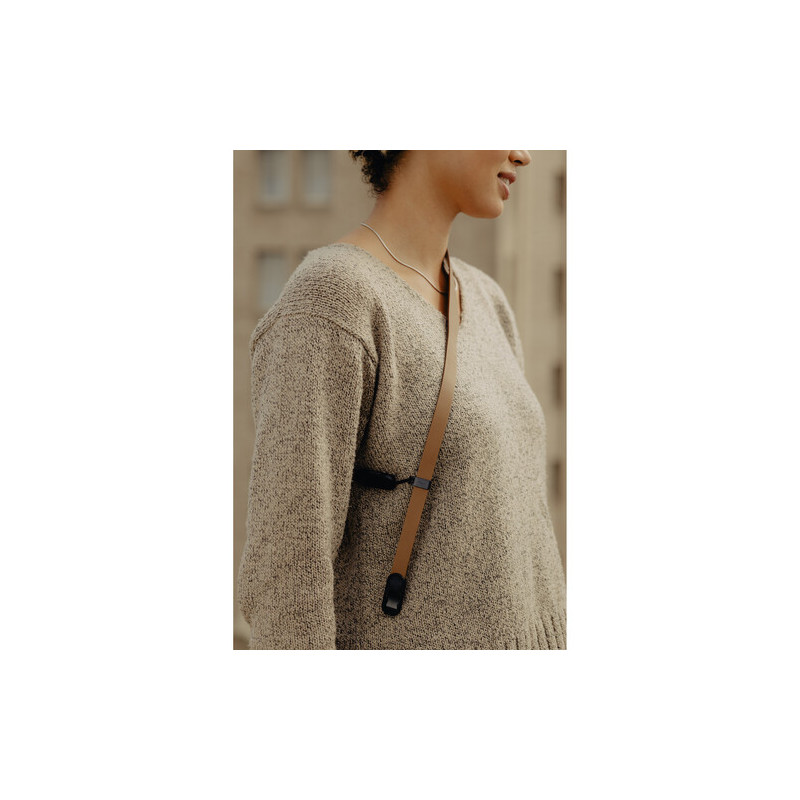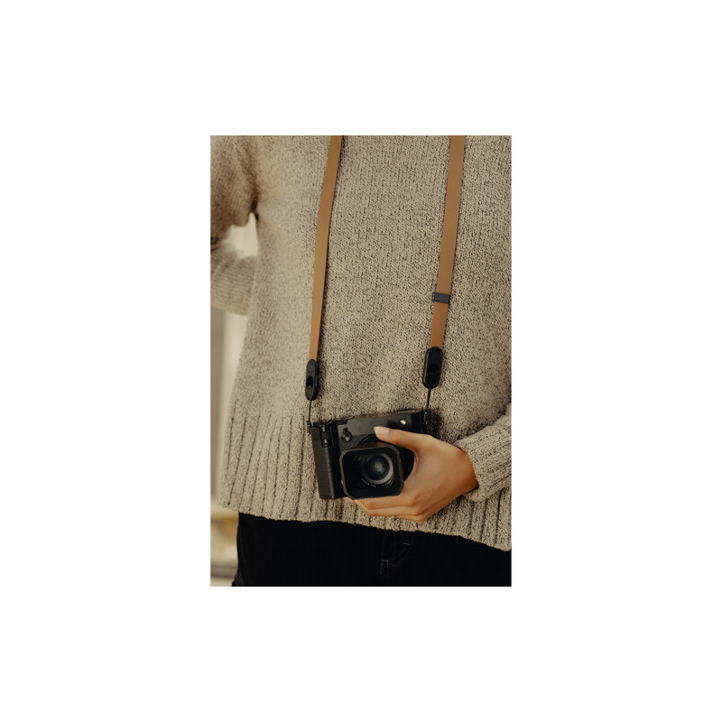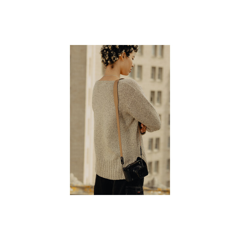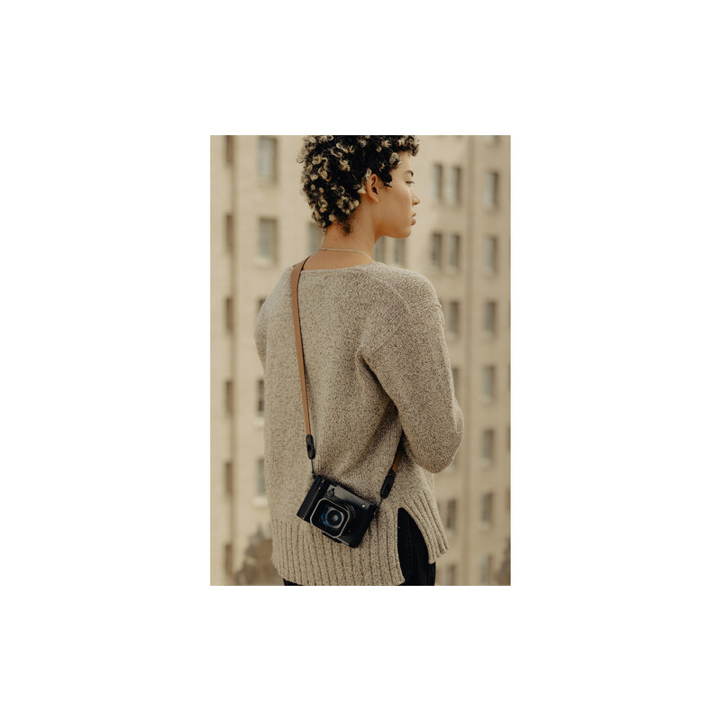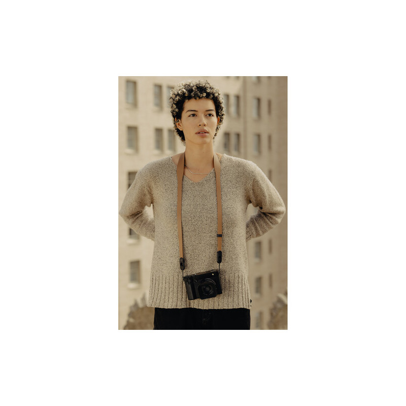 Ремъкът е изработен от естествена кожа, която предлага по-добър контакт с тялото и по-стабилно усещане при носене, а конструкцията е проектирана така, че да разпределя теглото по-равномерно. Ширината от 1,65 см, разширяваща се до 3 см в зоната на рамото, допринася за по-висок комфорт при работа с по-тежка техника, без ремъкът да става обемен или неудобен. Въпреки кожената конструкция, общото тегло остава ниско от 57 г.