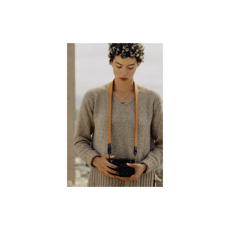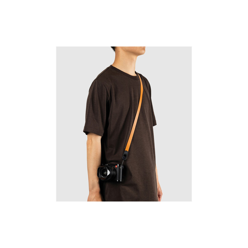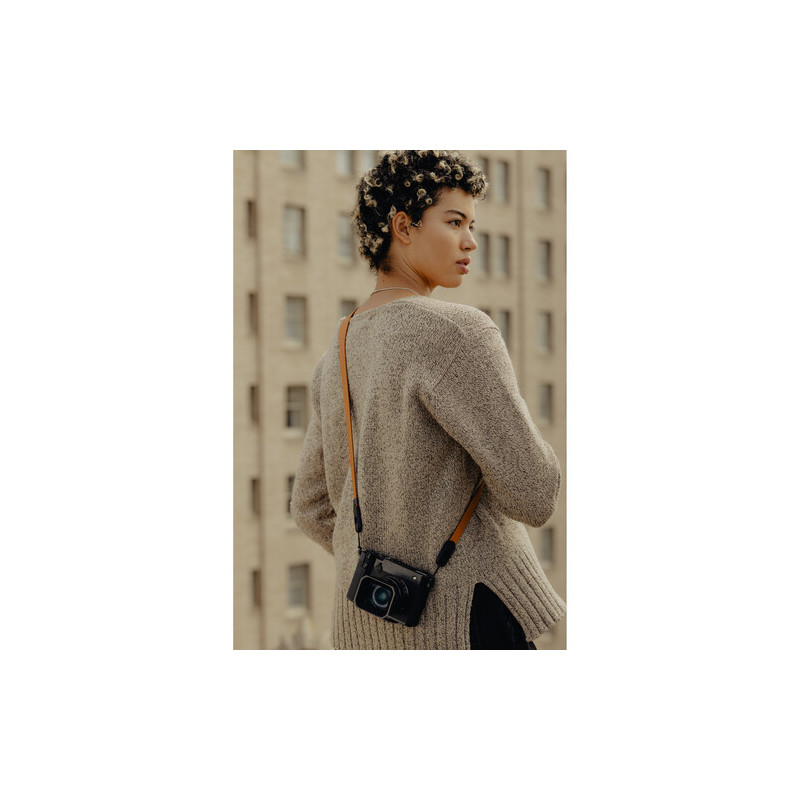 Ремъкът е изработен от естествена кожа, която предлага по-добър контакт с тялото и по-стабилно усещане при носене, а конструкцията е проектирана така, че да разпределя теглото по-равномерно. Ширината от 1,65 см, разширяваща се до 3 см в зоната на рамото, допринася за по-висок комфорт при работа с по-тежка техника, без ремъкът да става обемен или неудобен. Въпреки кожената конструкция, общото тегло остава ниско от 57 г.
