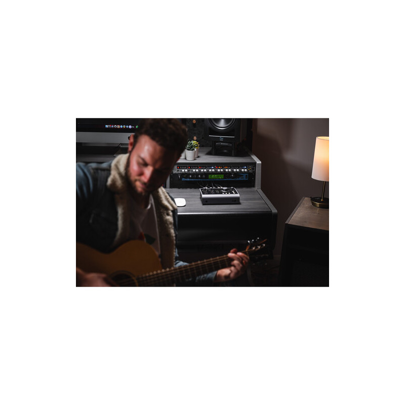 Интерфейсът разполага и с отделен Hi-Z вход за директно включване на китара или бас, оптимизиран за инструменти с импеданс над 500 kΩ. Това осигурява коректно съгласуване и запазване на динамиката и тоналния баланс на инструмента при директен запис.