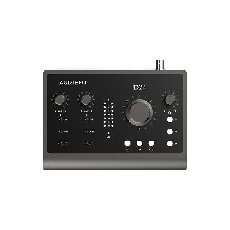 В основата на iD24 MKII стоят два комбинирани XLR/¼" TRS микрофонни/линейни входа с предусилватели, базирани на конзолната технология на Audient. Те предлагат усилване от 0 до +58 dB, изключително нисък собствен шум с EIN 129 dB A-weighted и превключваем пад от -10 dB на всеки канал. Това позволява работа както с чувствителни кондензаторни микрофони, така и със силни линейни източници без риск от клипинг. Вграден високочестотен филтър на 100 Hz улеснява контрола на нискочестотния шум още на входа.