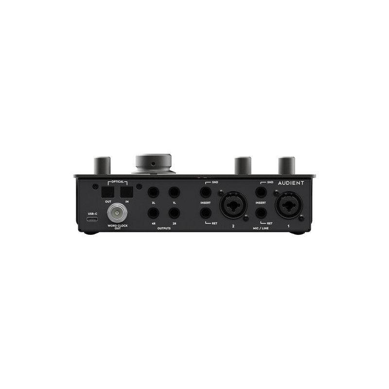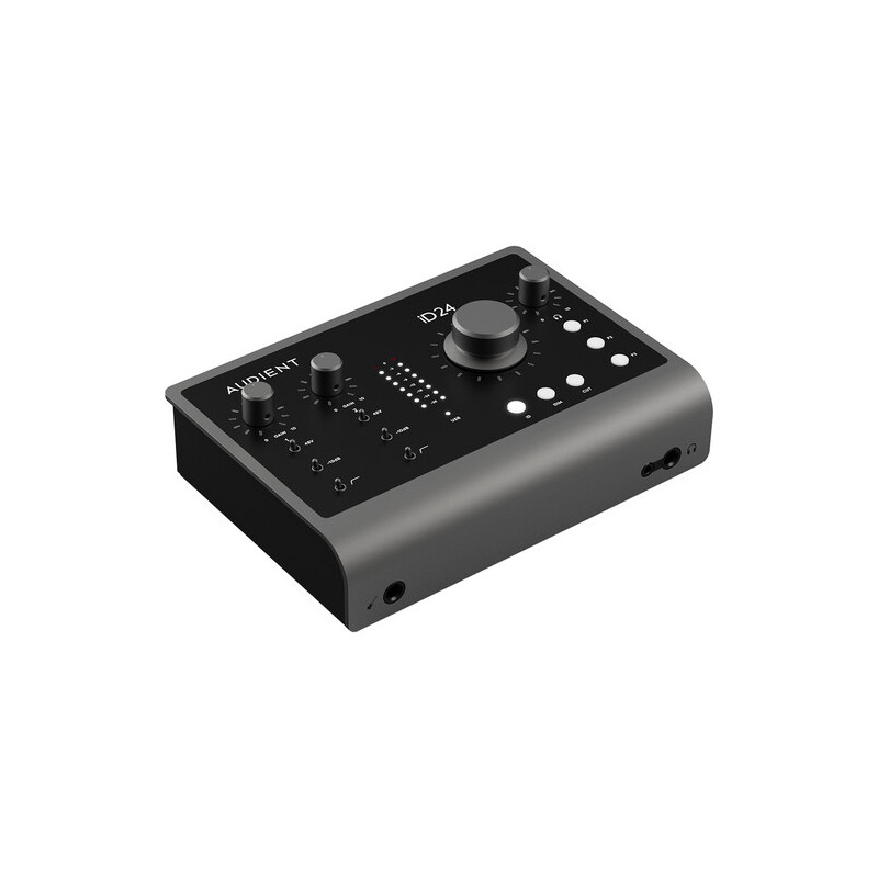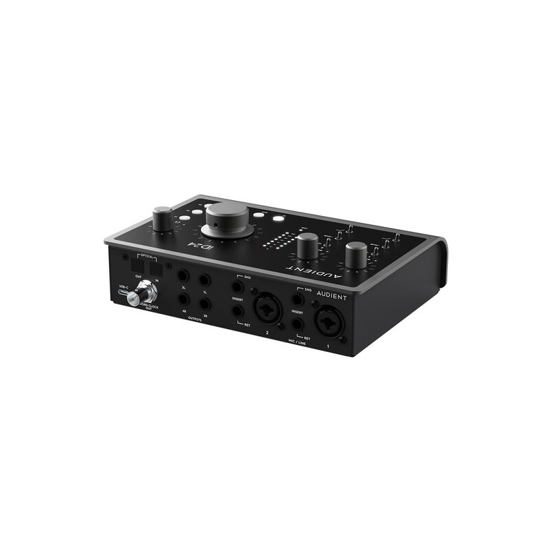 В основата на iD24 стоят два комбинирани XLR/¼" TRS микрофонни/линейни входа с предусилватели, базирани на конзолната технология на Audient. Те предлагат усилване от 0 до +58 dB, изключително нисък собствен шум с EIN 129 dB A-weighted и превключваем пад от -10 dB на всеки канал. Това позволява работа както с чувствителни кондензаторни микрофони, така и със силни линейни източници без риск от клипинг. Вграден високочестотен филтър на 100 Hz улеснява контрола на нискочестотния шум още на входа.